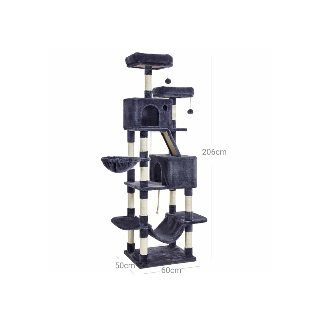 Ez a lenyűgöző, 206 cm magas macskafa minden macska álmát valóra váltja. Az öt különböző szint mindegyike egyedi funkcióval rendelkezik - a kényelmes pihenőhelyektől kezdve a privát odúkig és a játékos függőágyig. A 13 sisalborítású kaparóoszlop és a speciális kaparólejtő tökéletes lehetőséget biztosít a karomápolásra.