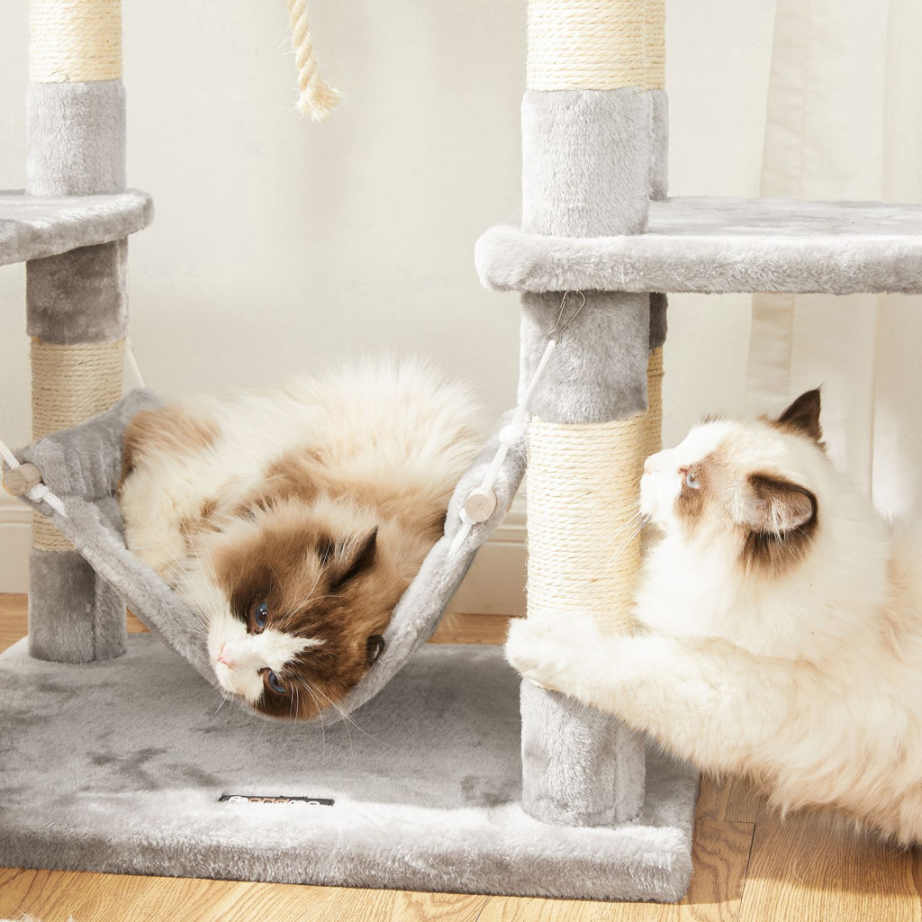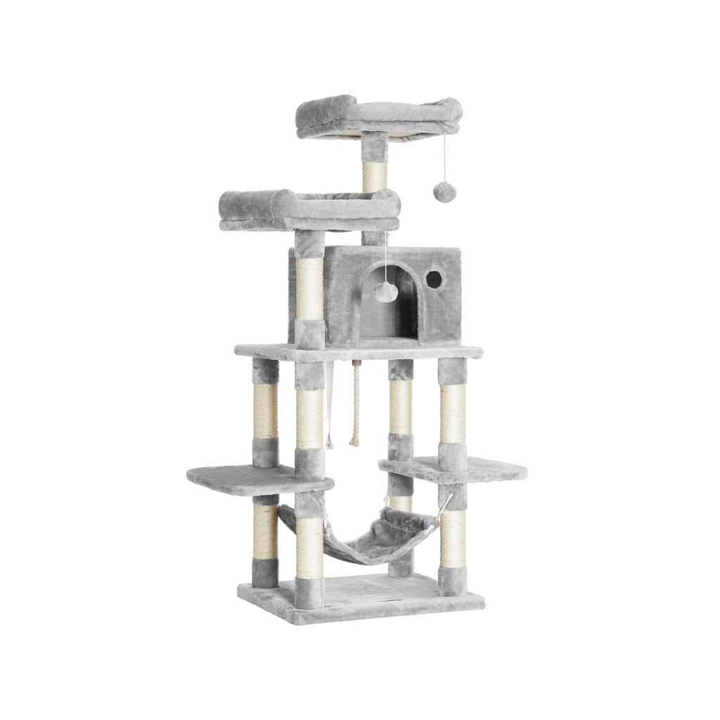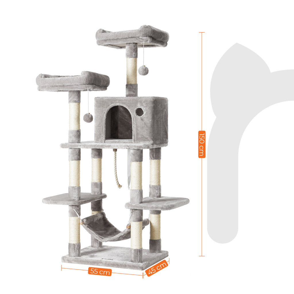 Ez a 150 cm magas macskafa minden cicának ideális játszó- és pihenőhelyet biztosít. A puha plüss borítású pihenőfelületek, a kényelmes barlang és a függőágy tökéletes menedéket nyújtanak, míg a sisalkötelekkel bevont oszlopok remek kaparófaként szolgálnak.