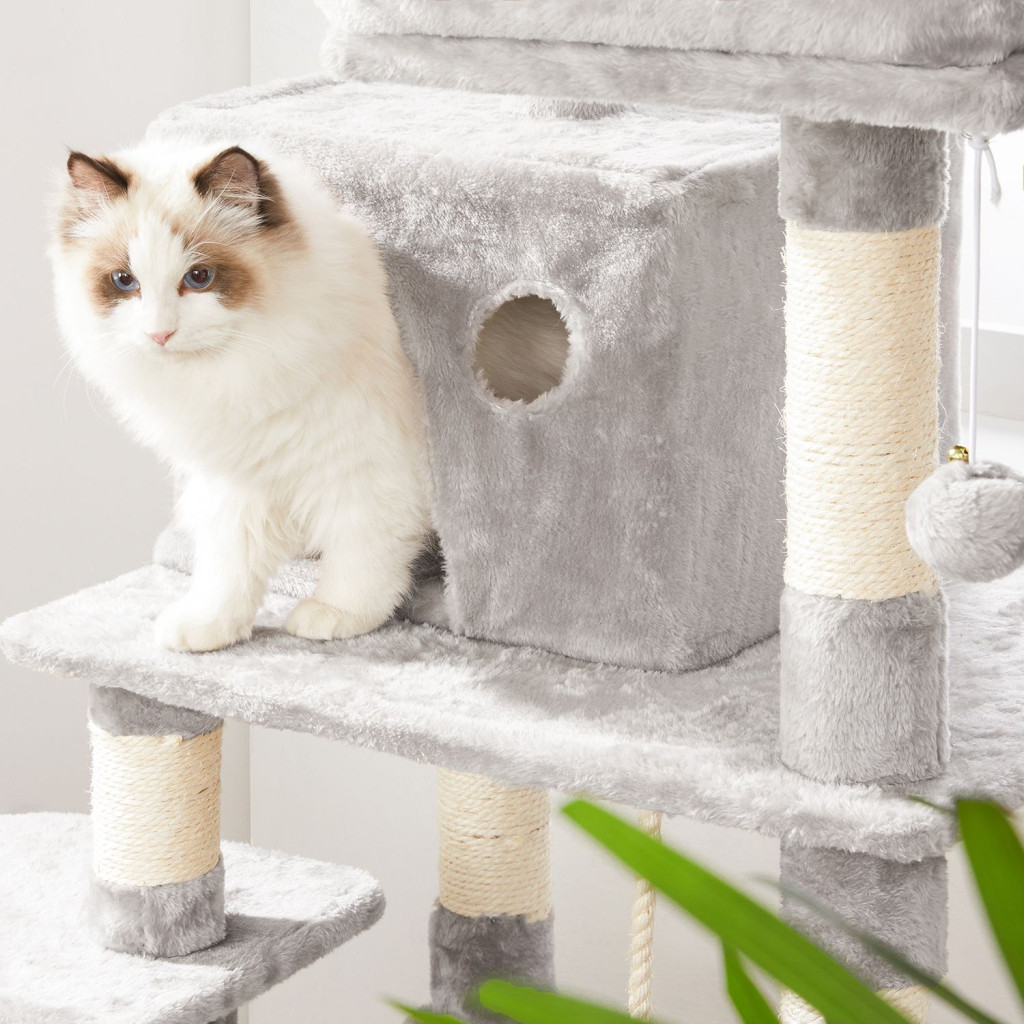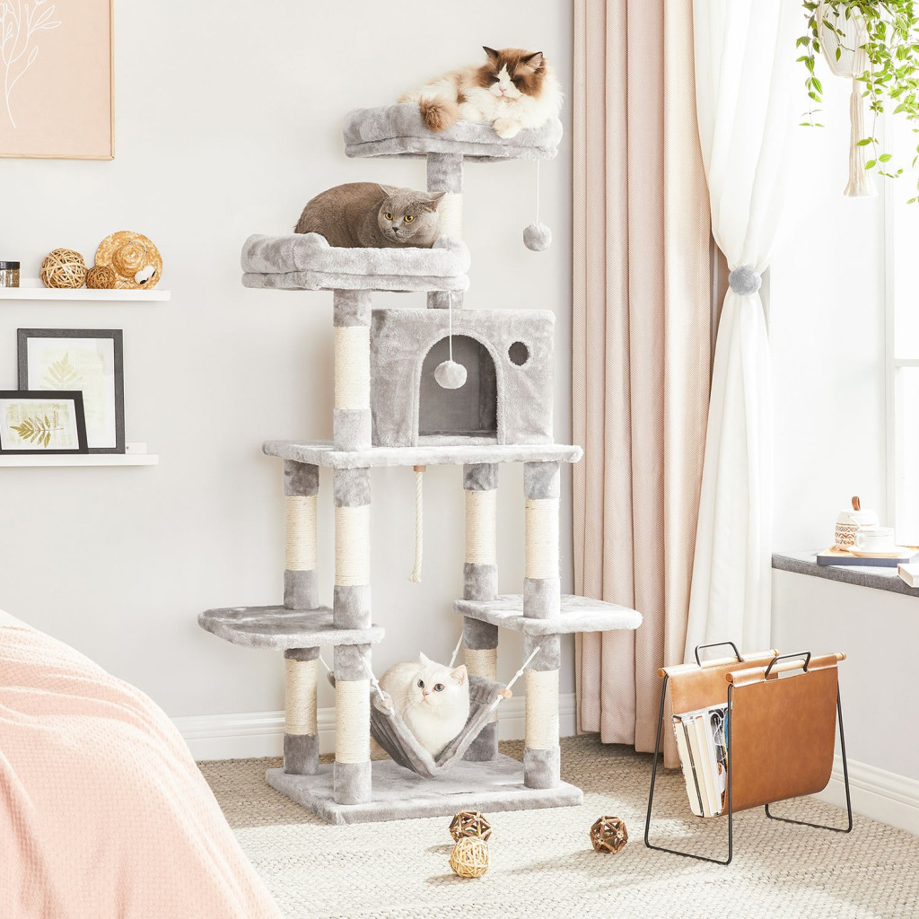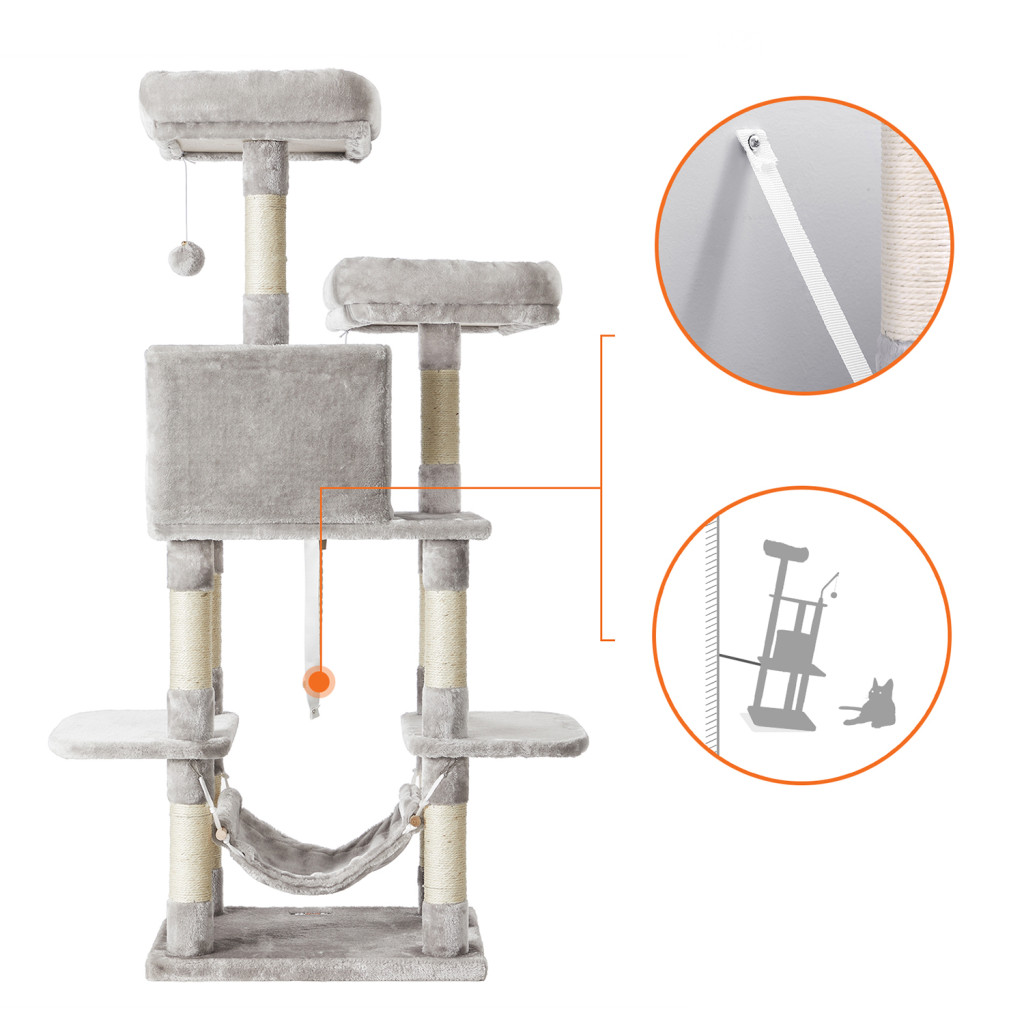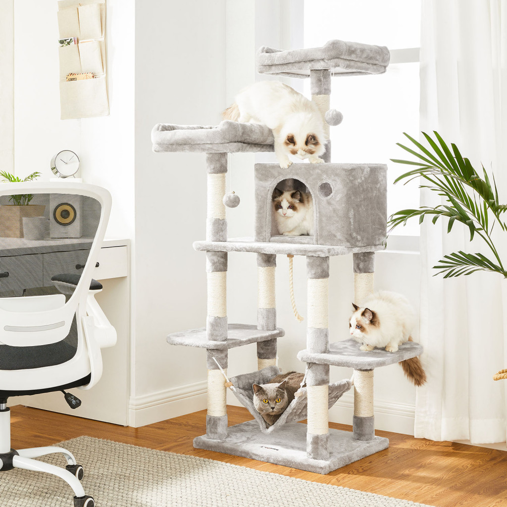 Ez a 150 cm magas macskafa minden cicának ideális játszó- és pihenőhelyet biztosít. A puha plüss borítású pihenőfelületek, a kényelmes barlang és a függőágy tökéletes menedéket nyújtanak, míg a sisalkötelekkel bevont oszlopok remek kaparófaként szolgálnak.