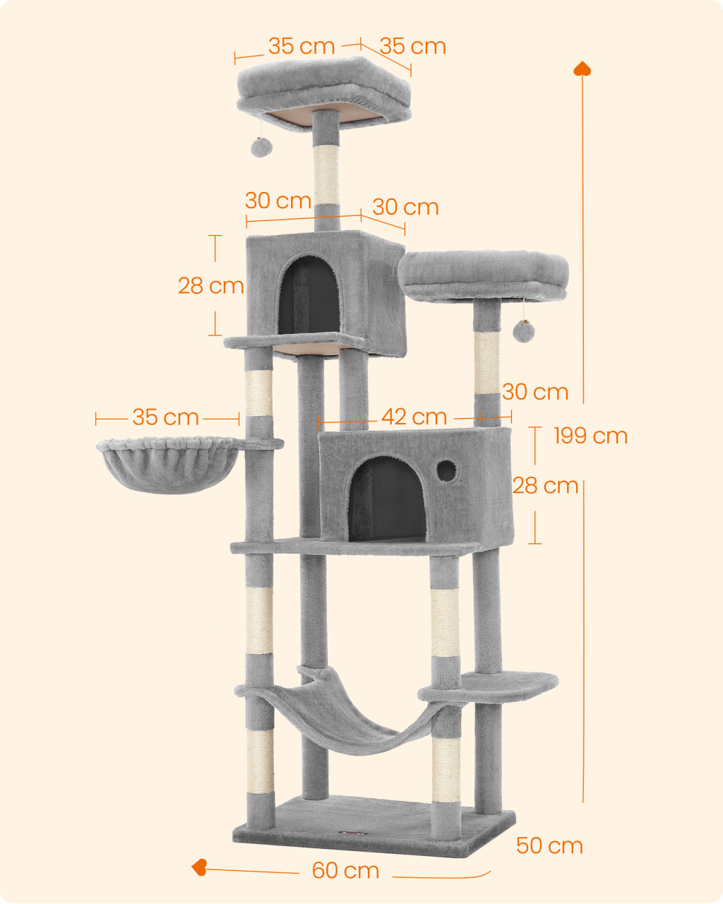 Kompakt, 199 cm magas macskatorony két búvóhellyel, függőággyal és 10 karomélező oszloppal, amely tökéletes megoldást nyújt a macskák mozgásigényének kielégítésére.