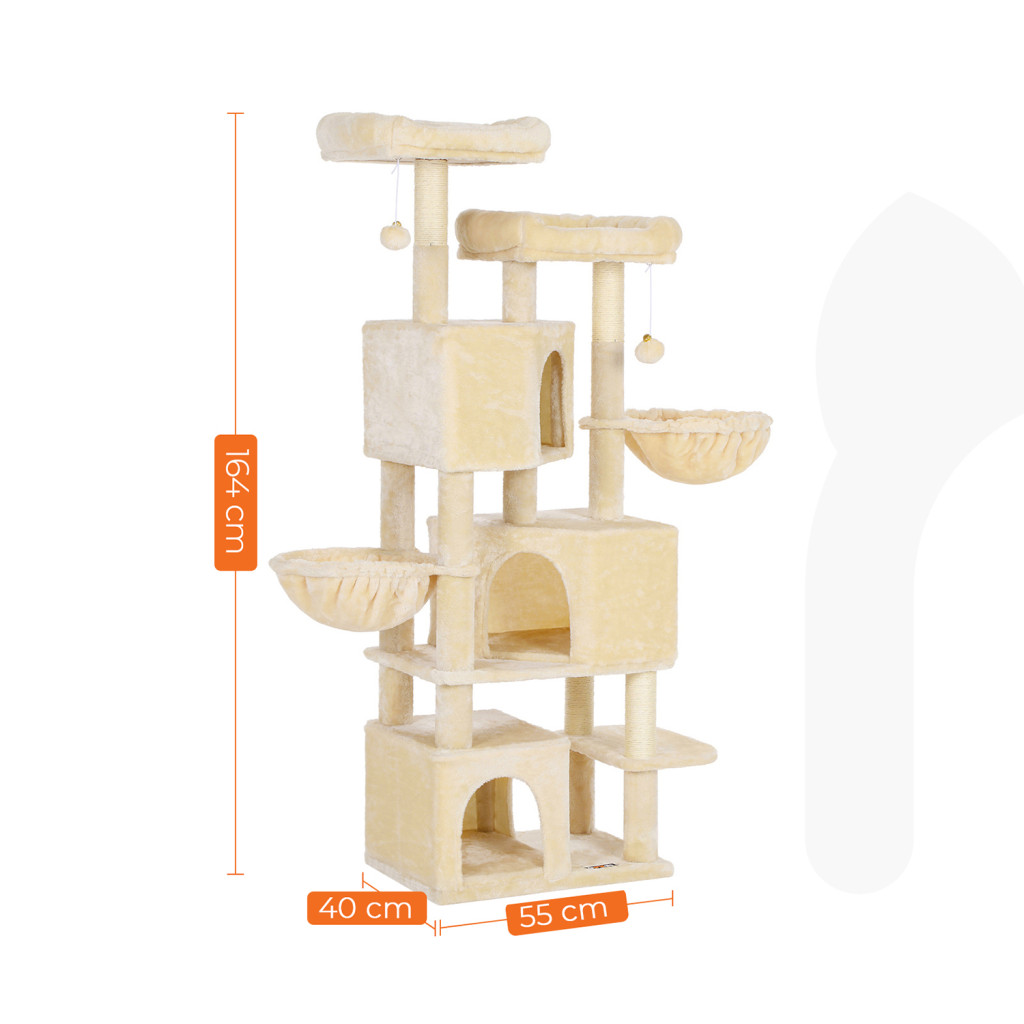 Ez a 164 cm magas macskafa valódi paradicsom a cicák számára, amely egyesíti a játék, pihenés és kalandozás lehetőségeit. A stabil szerkezet három kényelmes barlangot, két puha pihenőkosarat és két párnázott kilátóplatformot kínál, tökéletes menedéket nyújtva akár egy egész macskacsalád számára.