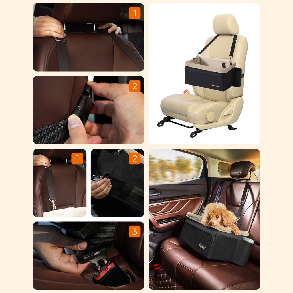 Biztonságos és kényelmes autós ülés kisméretű kutyák számára, állítható magassággal és könnyen tisztítható kivitelben.