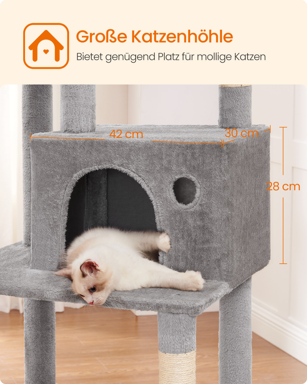 • Két búvóhely puha belsővel: A tágas, plüss belsejű búvóhelyek biztonságos visszavonulási lehetőséget kínálnak, ahol a macska zavartalanul pihenhet és megfigyelheti környezetét