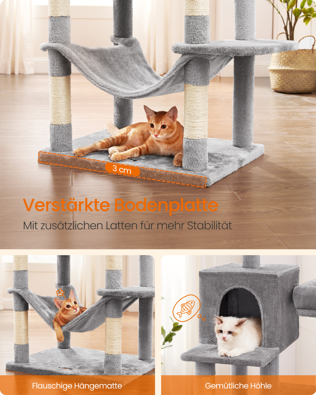 A FEANDREA PCT196W01 macskatorony egy átgondottan megtervezett, 199 cm magas játszótér, amely minden igényt kielégít cicája számára. A szürke plüss bevonatú szerkezet két tágas búvóhelyet kínál, ahol macskája nyugodtan pihenhet és biztonságban érezheti magát. A természetes szizál kötéllel bevont oszlopok tökéletesek a karmok ápolásához, míg a különböző szinteken elhelyezett platformok lehetővé teszik a macskák természetes mászási és ugrási ösztönének kielégítését.