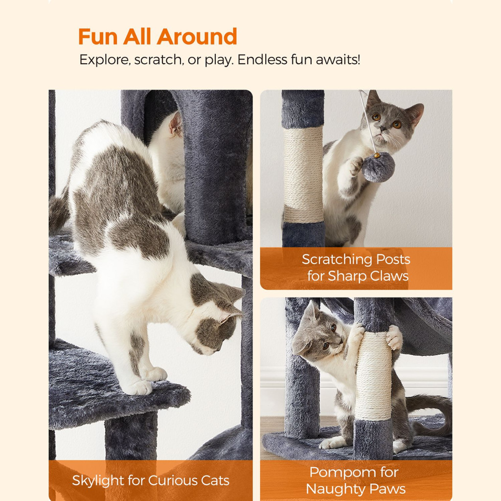 • Többfunkciós kialakítás: pihenőhelyek, kaparófelületek és játéklehetőségek egy helyen