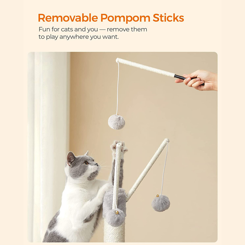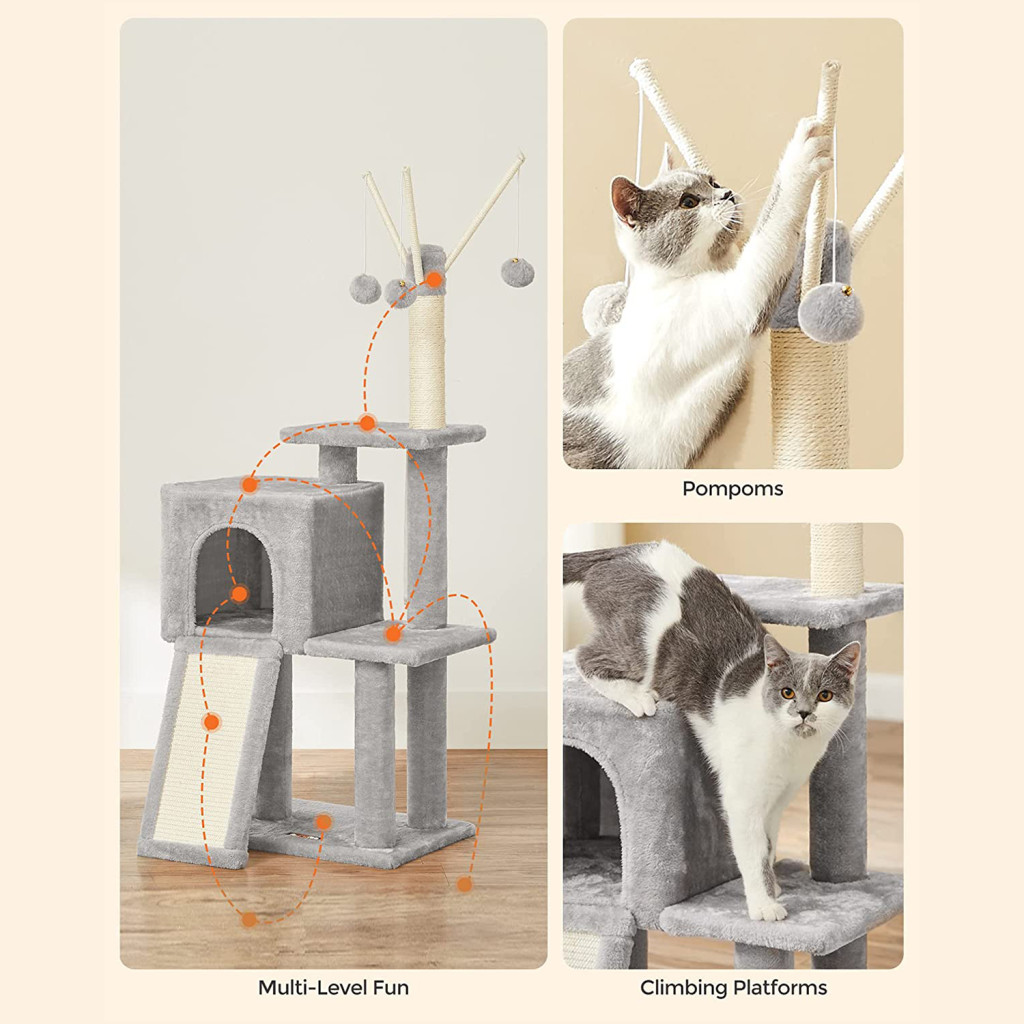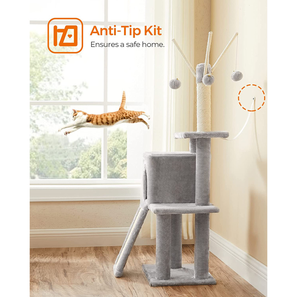 A sisalból készült kaparófelületek és a levehető pompon játékok folyamatos szórakozást nyújtanak, miközben a megerősített alapzat és az anti-tip kit maximális biztonságot garantál. A rampa segíti az idősebb vagy mozgásukban korlátozott cicákat a könnyebb feljutásban.