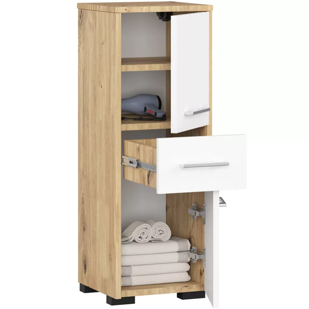Ez a modern fürdőszobai állószekrény az Artisan tölgy és fehér színek elegáns kombinációjával tökéletesen illeszkedik bármilyen fürdőszobai környezetbe. A 16 mm-es laminált bútorlapból készült szekrény kiváló minőségű ABS élzárással rendelkezik, ami tartósságot és hosszú élettartamot biztosít.
