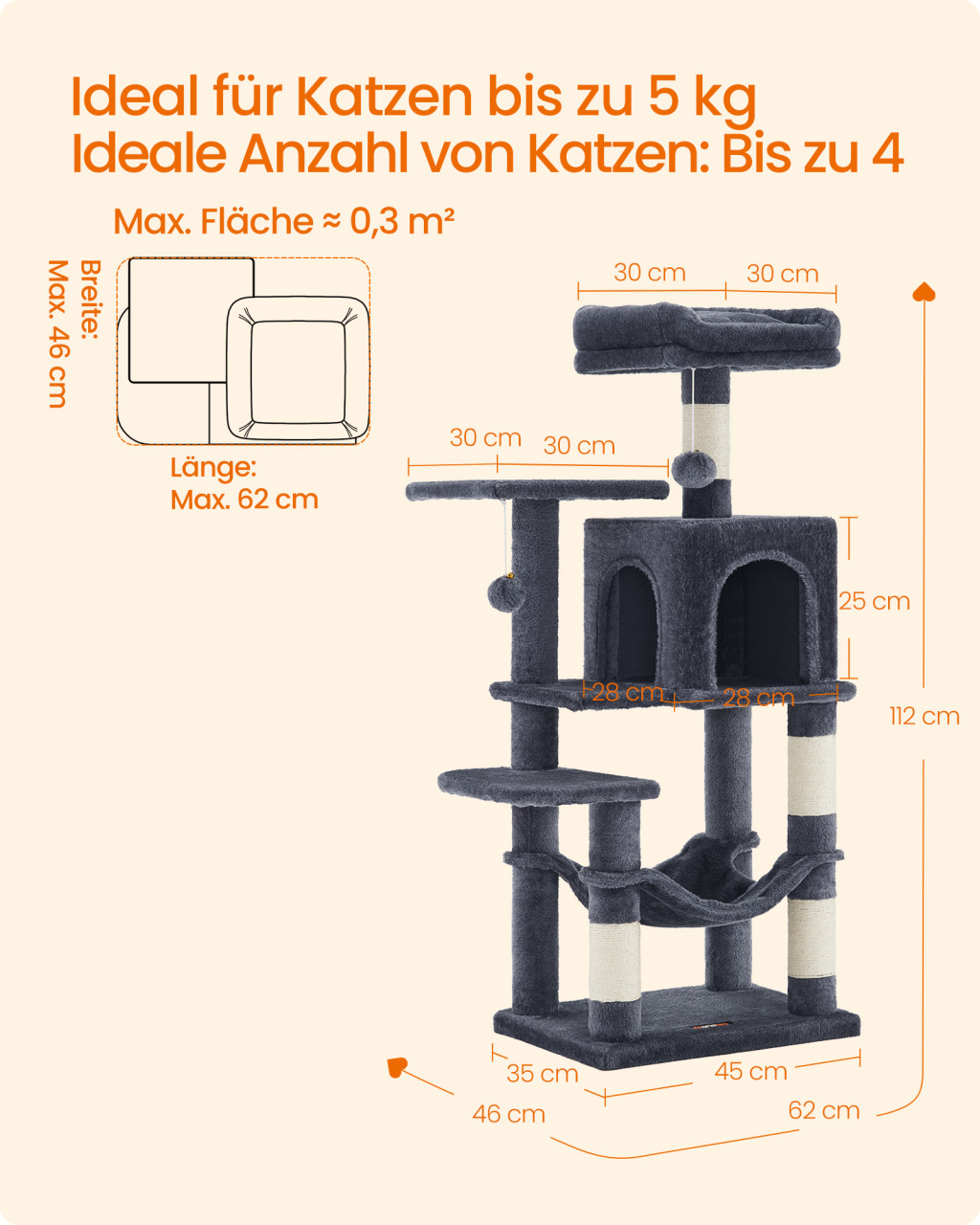 Feandrea 112 cm macskaház kaparófa 4 kaparóoszloppal, 2 pihenőplatformmal, 1 barlanggal, 1 függőággyal, 2 pomponnal, többszintes plüss, füstszürke