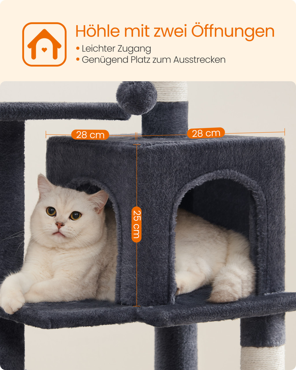 A Feandrea 112 cm magas macskaház tökéletes játszótér és pihenőhely macskák számára, 4 szizállal bevont kaparóoszloppal, kényelmes barlanggal, puha függőággyal és interaktív pomponokkal. A füstszürke plüss bevonat elegáns megjelenést kölcsönöz, miközben akár 4 macska számára biztosít kényelmes szórakozást és pihenést.
