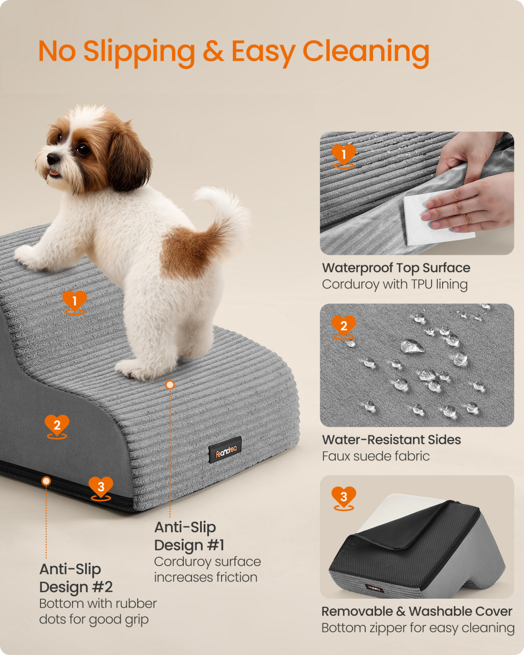 A Feandrea kutyalépcső forradalmi megoldást kínál kis testű, idősebb, sérült vagy rövid lábú kutyák számára. Az enyhe lejtésű kialakítás ízületkímélő alternatívát nyújt a hagyományos derékszögű lépcsőkkel szemben, lehetővé téve kedvence számára, hogy könnyedén feljusson kedvenc pihenőhelyeire. A nagy sűrűségű habból készült lépcső stabil támasztást nyújt, miközben megőrzi alakját hosszú távú használat mellett is.
