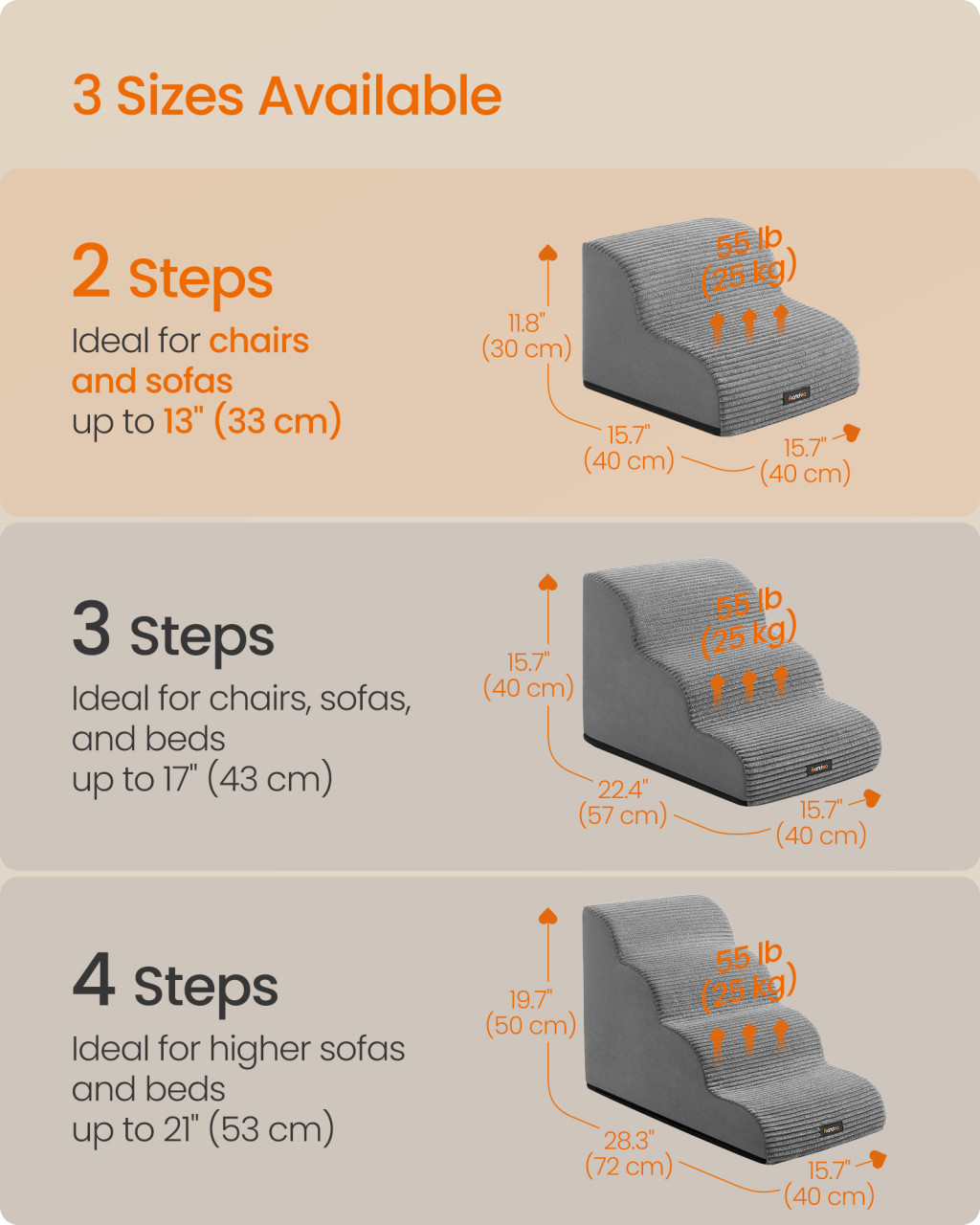 • Dupla csúszásgátló rendszer: A kordbársony felület és a gumipöttyös alsó rész kombinációja garantálja, hogy a lépcső stabilan maradjon, kedvence pedig magabiztosan közlekedjen