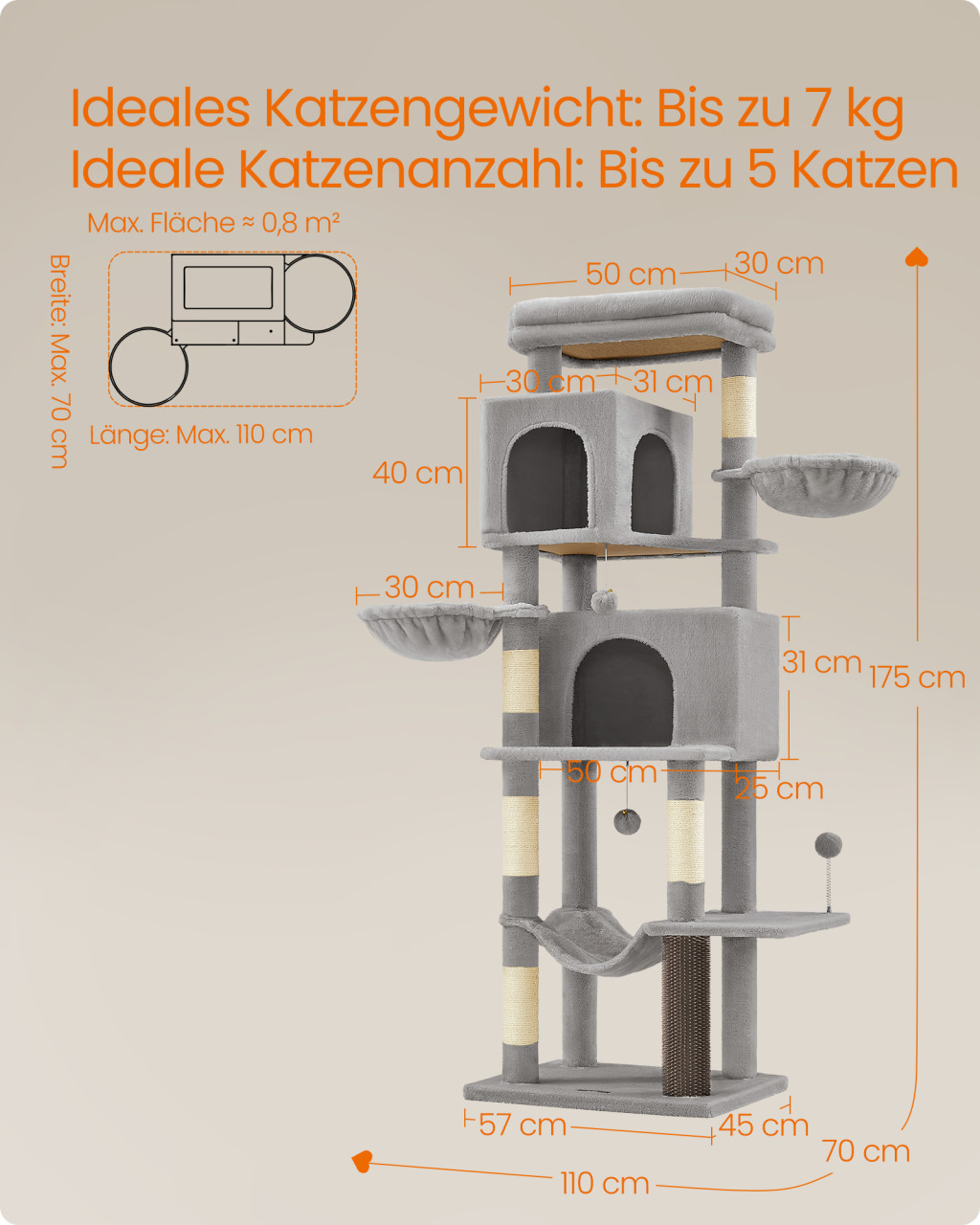 Többszintes, 175 cm magas luxus macskafa 2 barlangos pihenővel, 2 kosárral, függőággyal és 5 kaparófával, tökéletes választás több macskás háztartásokba.