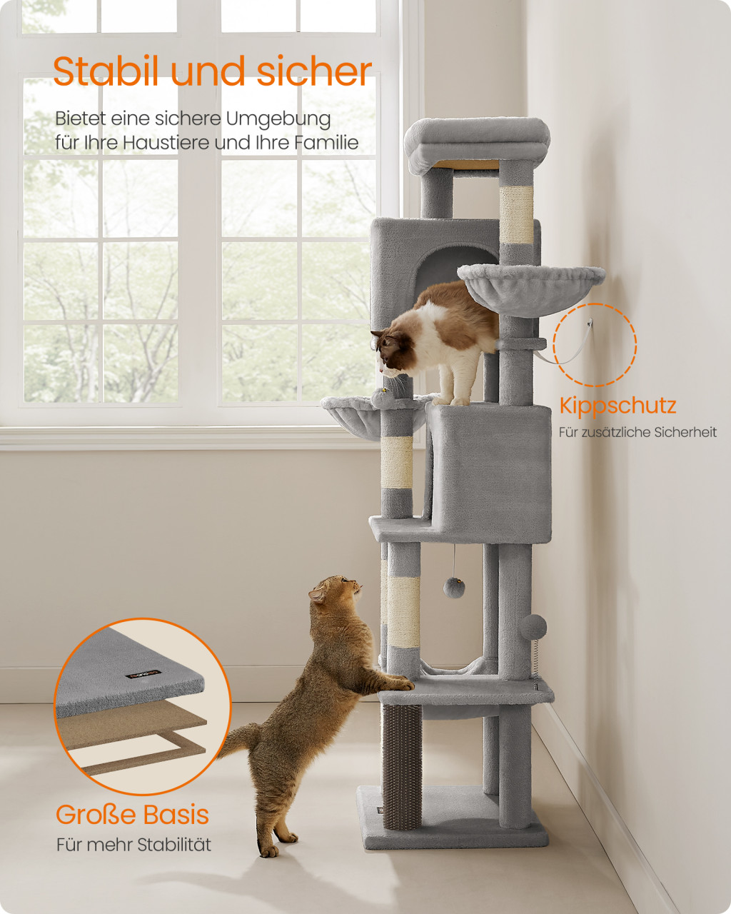 Ez a prémium minőségű macskafa minden amit cicája kívánhat - kényelmes pihenőhelyek, izgalmas játéklehetőségek és strapabíró kaparófelületek egyetlen bútor-remekműben. A 175 cm magas torony két privát barlangot, puha függőágyat és kosarakat kínál, tökéletes menedéket nyújtva akár több cicának is.