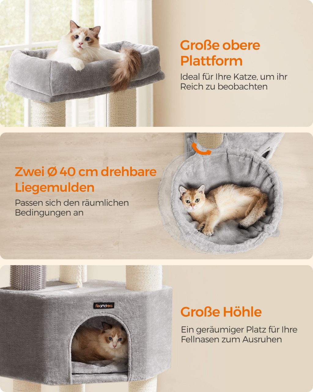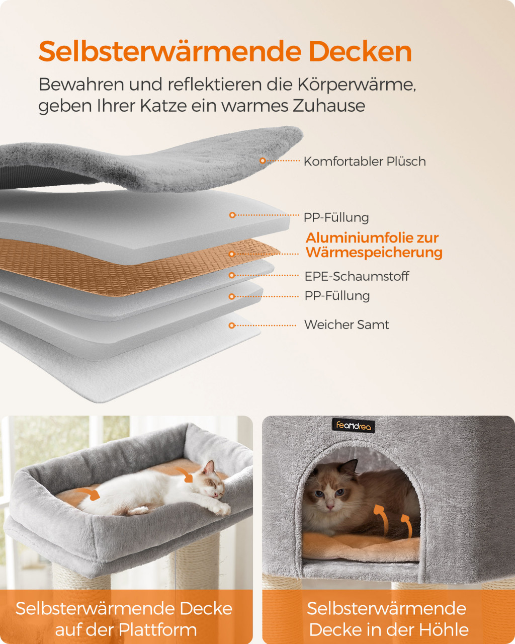 Feandrea Luxus Macskafa Nagyméretű Cicáknak Önmelegítő Párnákkal Galambszürke-Krémfehér