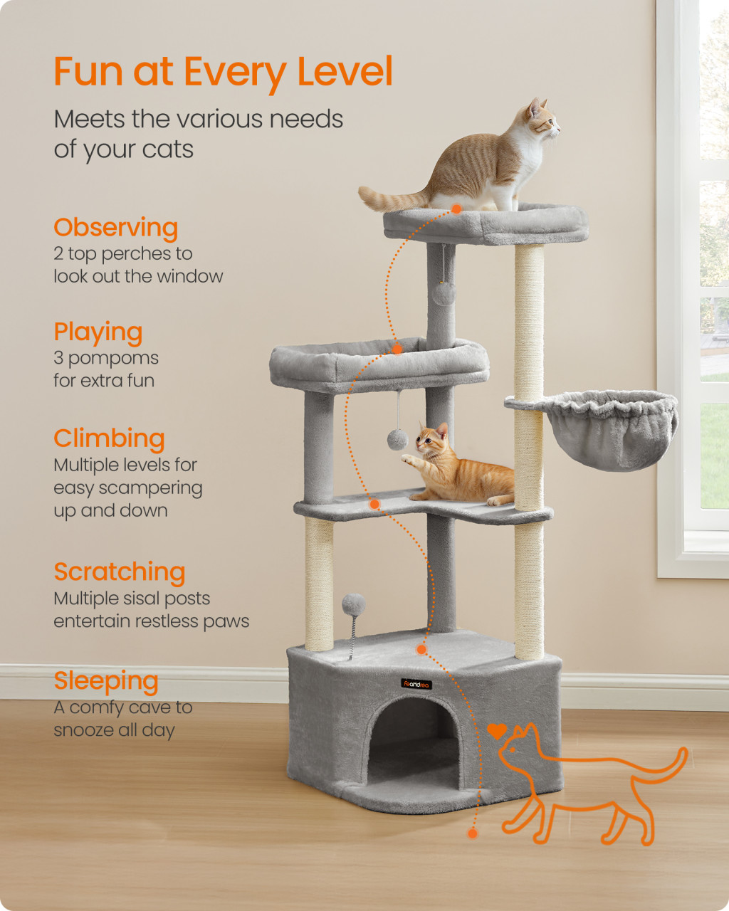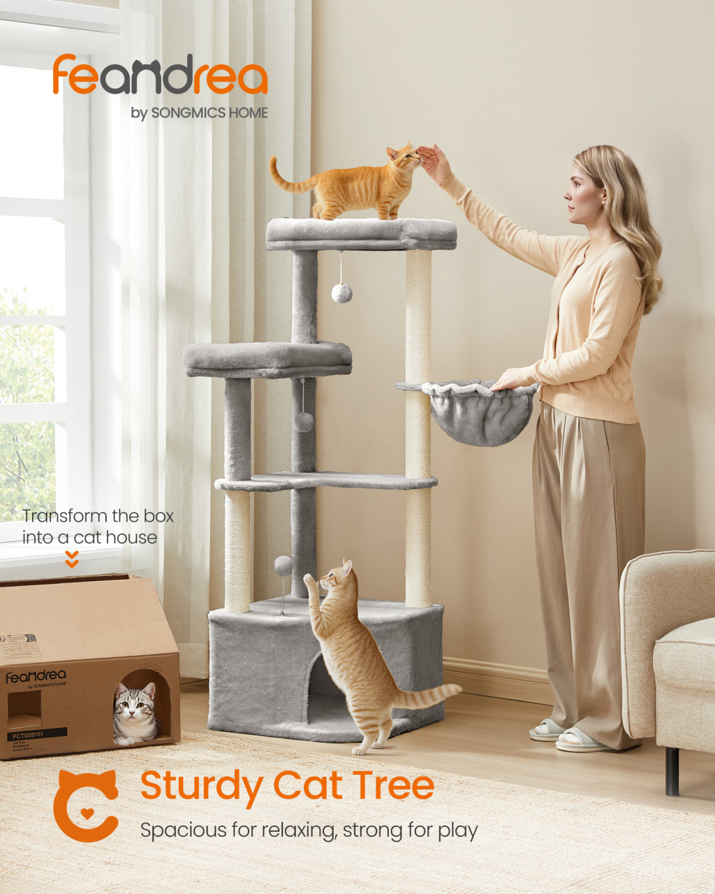 A Feandrea macskatorony minden igényt kielégít: a tágas barlang, a két nagy pihenőfelület és a függő kosár bőséges helyet kínál a pihenéshez és megfigyeléshez. A 140,7 cm magasság lehetővé teszi macskája számára, hogy különböző szinteken fedezze fel környezetét, miközben a négy szizállal bevont kaparóoszlop gondoskodik a karmok egészségéről.