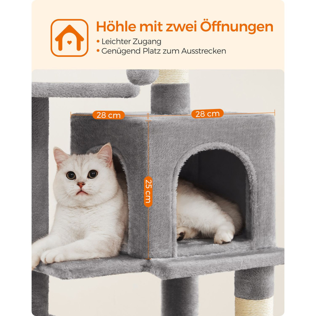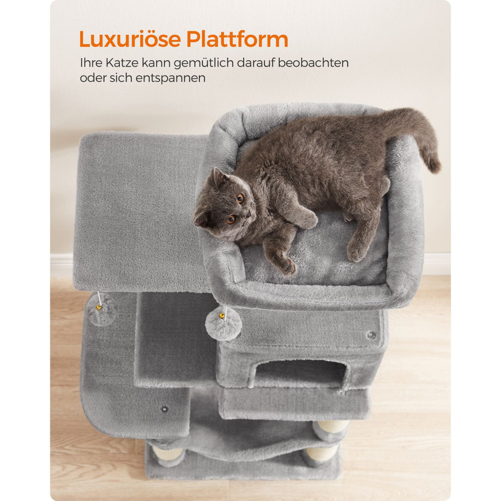 A Feandrea macskabútor átgondolt, többszintes kialakítása ideális megoldást kínál akár 4 macska számára is. A világosszürke plüss bevonatú szerkezet két kényelmes pihenőhelyet, egy tágas barlangt és egy puha függőágyat tartalmaz, így minden kedvenced megtalálhatja a számára legmegfelelőbb helyet a pihenéshez vagy a környezet megfigyeléséhez. A 112 cm magasság tökéletes egyensúlyt teremt a térhasználat és a macskák természetes mászási igénye között.
