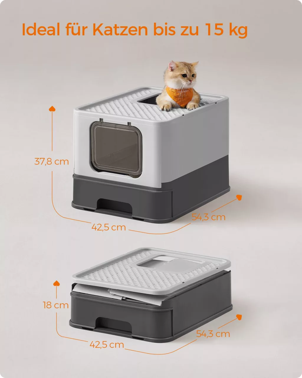 Modern, praktikus macska toalett beépített ráccsal és kihúzható tálcával, amely megakadályozza az alom szétszóródását és szivárgását. Tágas belső térrel rendelkezik nagyobb macskák számára is.