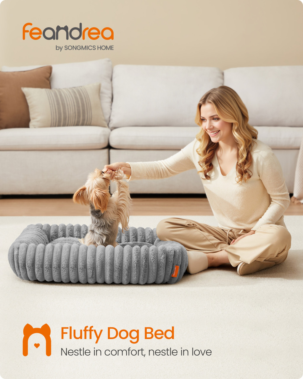 A Feandrea kutyaágy a tökéletes pihenőhely közepes méretű kutyák számára, amely egyesíti a stílust, a kényelmet és a praktikusságot. A bordázott műnyúlszőr felület és a prémium PP töltet felhőszerű puhaságot biztosít, ahol kedvence igazán ellazulhat és feltöltődhet. A megemelt, párnázott szélek nemcsak a nyak és a fej támasztását segítik, hanem biztonságérzetet is nyújtanak, ami különösen fontos az idősebb kutyák és az energikus kölykök számára.