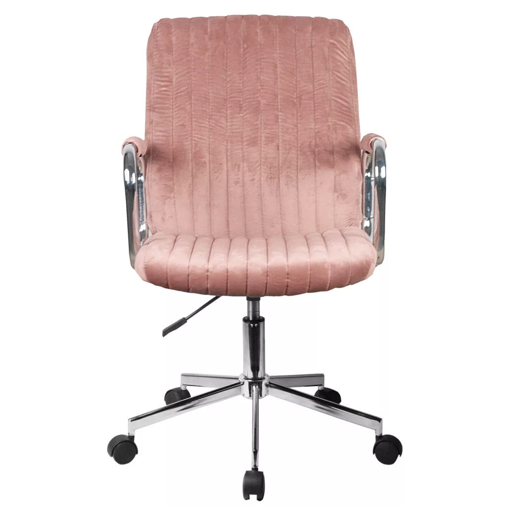 Elegáns, rózsaszín velúr irodai szék állítható magassággal és króm karfákkal, amely tökéletesen ötvözi a kényelmet és a stílust.