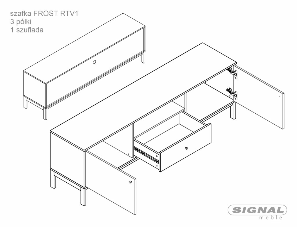 A szekrény tágas belső tere, fiókjai és nyitott polca tökéletes helyet biztosítanak a szórakoztató elektronikai eszközöknek és kiegészítőknek. A minőségi laminált lap felületek könnyen tisztíthatók és tartósak.
