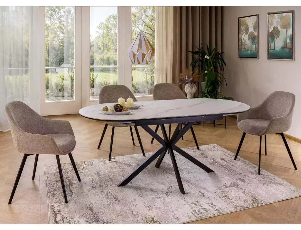 A Gaston Ceramic étkezőasztal ötvözi a modern dizájnt a funkcionalitással. A mattfehér kerámia asztallap nem csak esztétikus, de rendkívül strapabíró is, míg a mattfekete fém keresztláb szerkezet stabil alapot és különleges megjelenést biztosít.