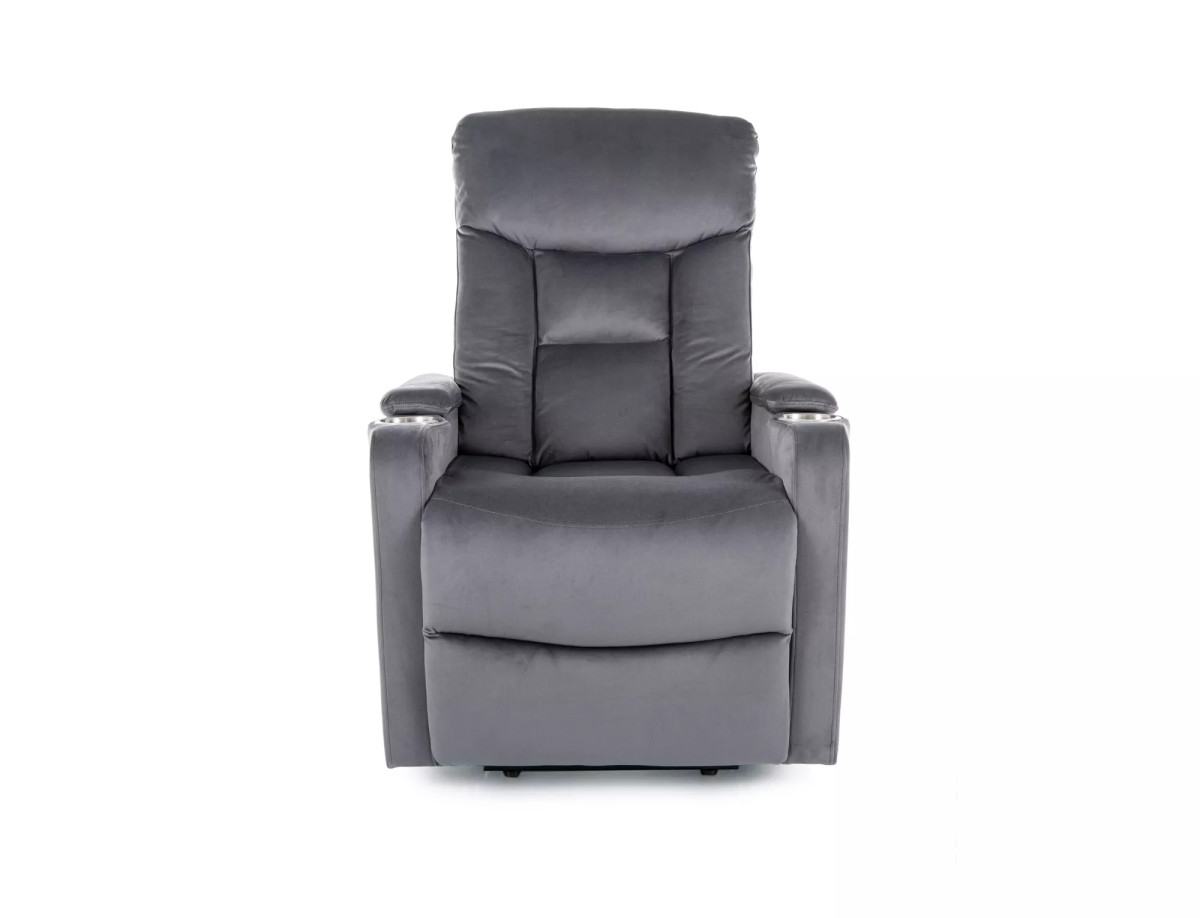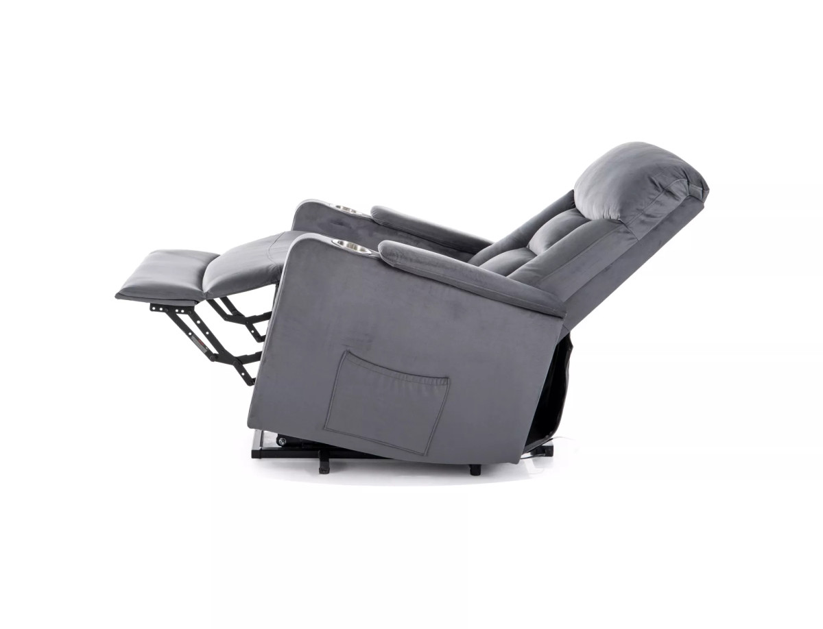 Luxus kényelmet nyújtó elektromos relax fotel bársony kárpitozással, beépített pohártartóval és praktikus oldaltárolóval.