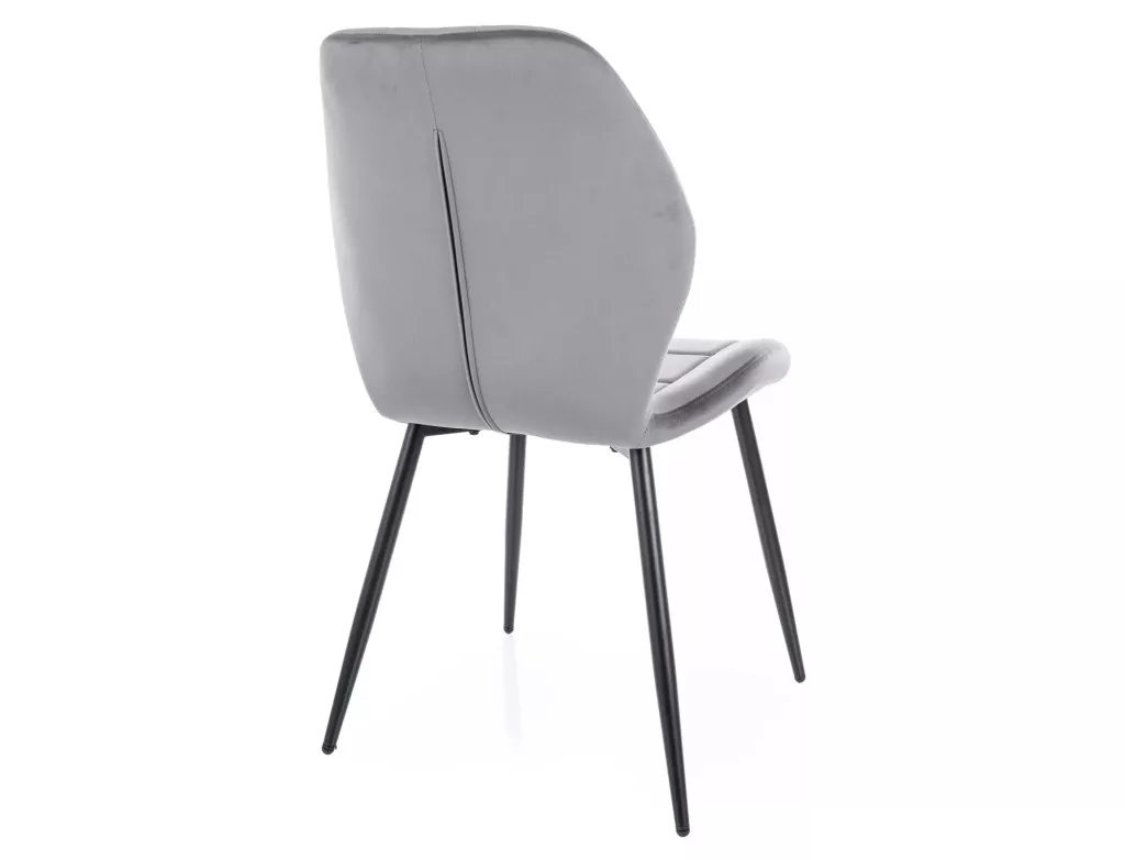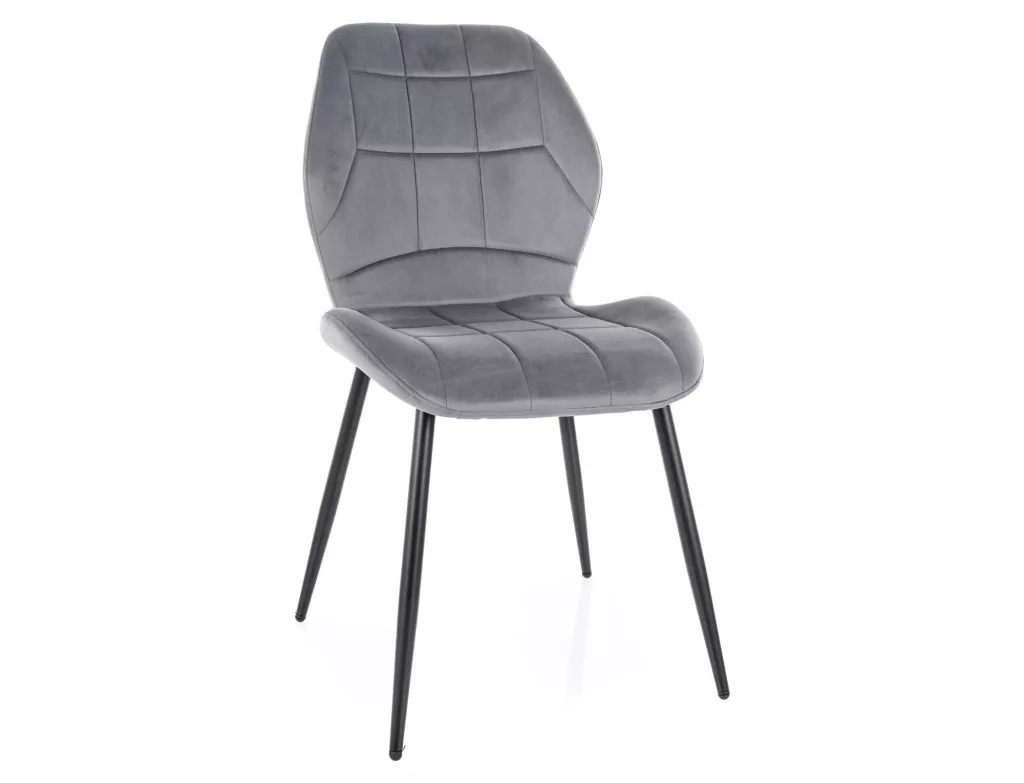 Elegáns, modern étkezőszék puha bársony kárpitozással és stílusos fekete fém lábakkal, amely tökéletes választás az étkezőbe vagy dolgozószobába.