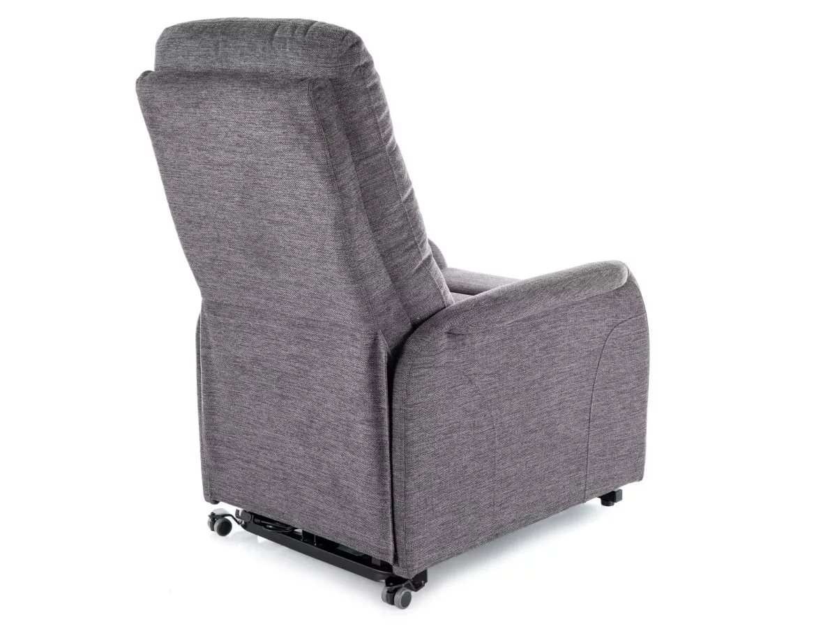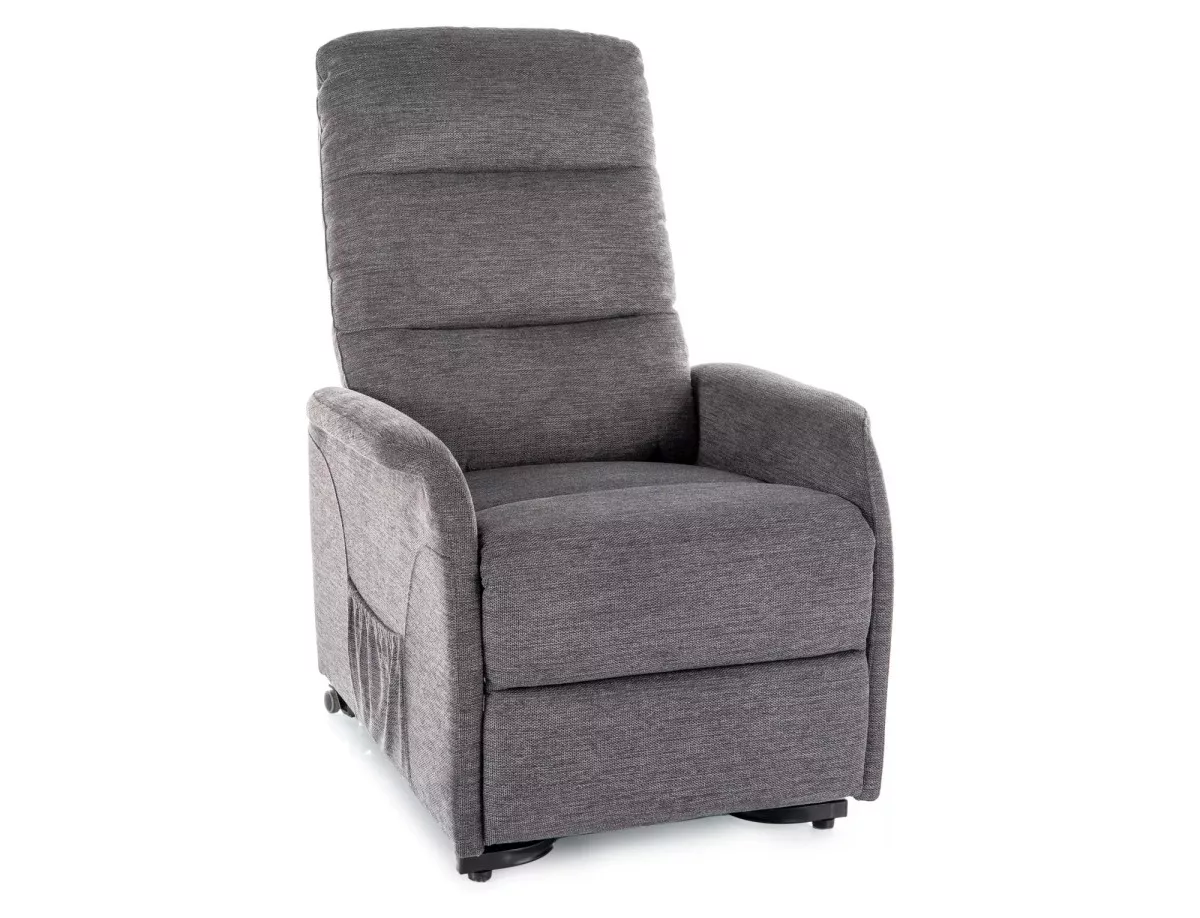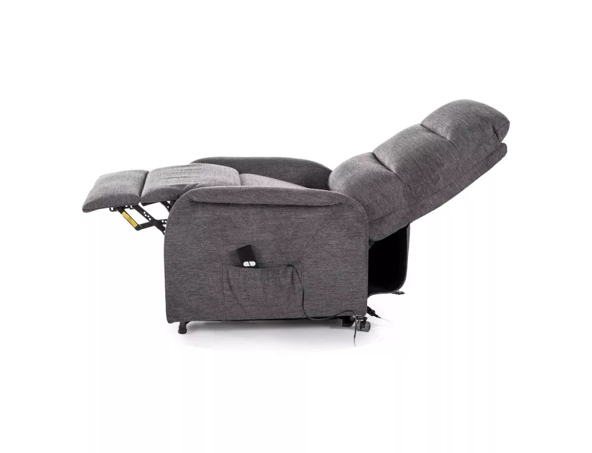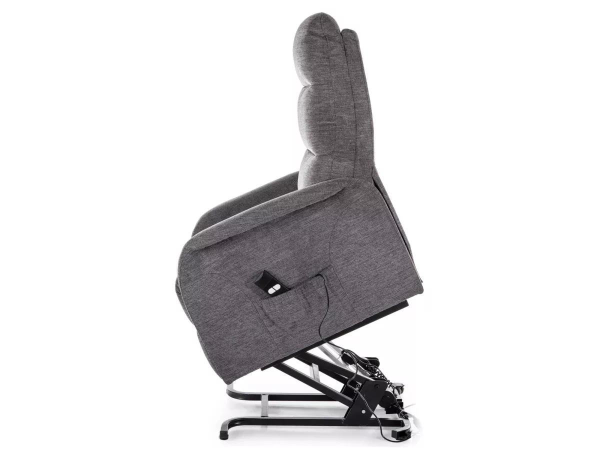 Kényelmes, elektromosan állítható masszázsfotel praktikus oldaltárolóval és két vezetékes távirányítóval. A sötétszürke Brego szövet kárpitozás és a fekete fém váz elegáns megjelenést kölcsönöz.