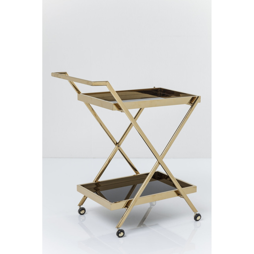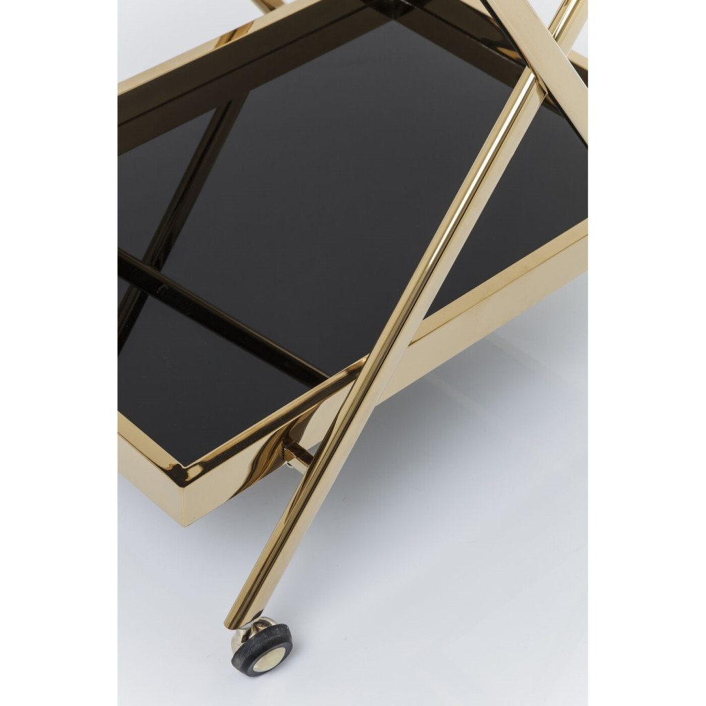 A KARE Design Casino bárszerviz kocsi a modern luxus és praktikum tökéletes ötvözete. Az arany színű, sárgaréz bevonatú acél váz és a két fekete edzett üvegpolc elegáns megjelenést kölcsönöz a darabnak. Az X-alakú váz nem csak stílusos, de stabil alapot is biztosít a biztonságos használathoz.
