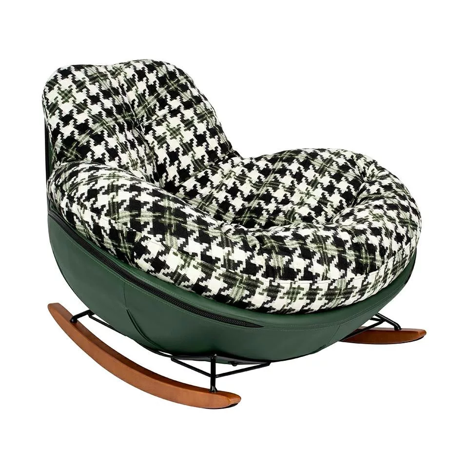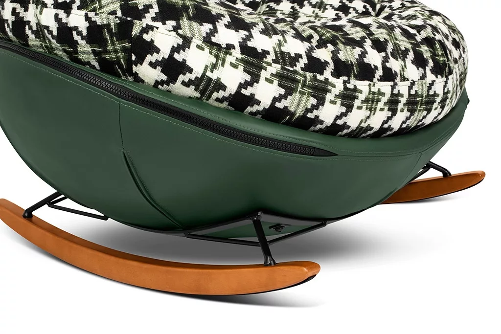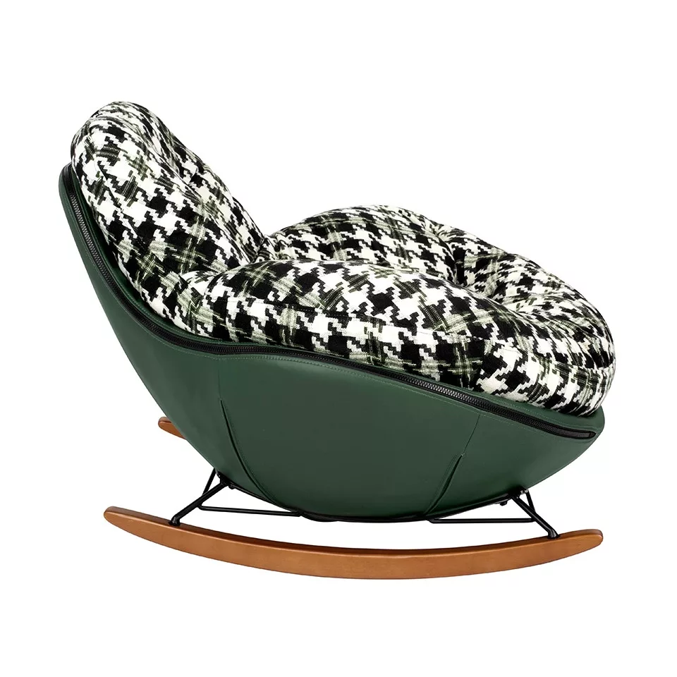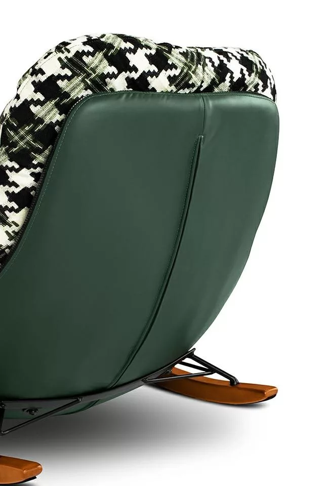 Kényelmes, modern hintaszék zöld műbőr vázzal és pepita mintás párnázattal, amely tökéletes választás a nyugodt pihenéshez.