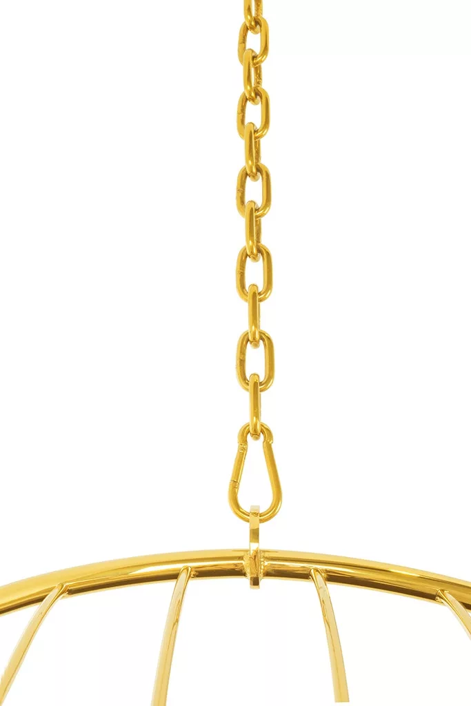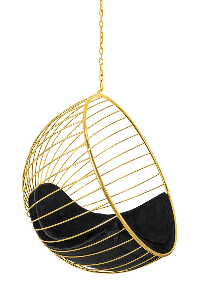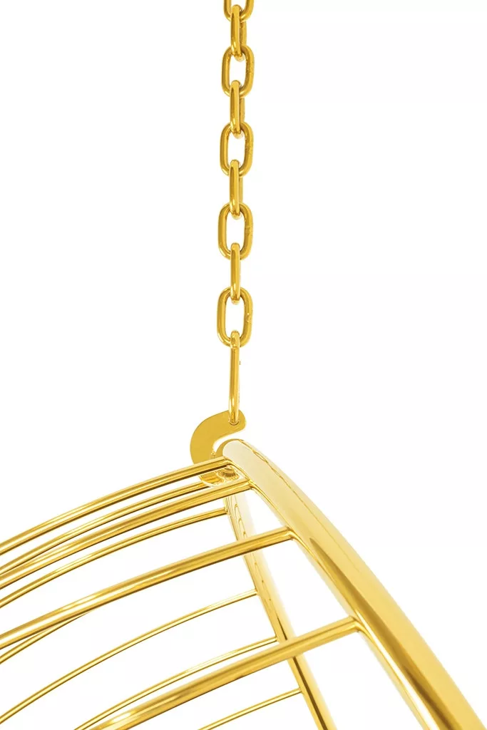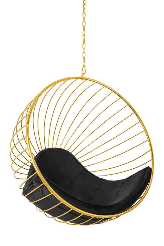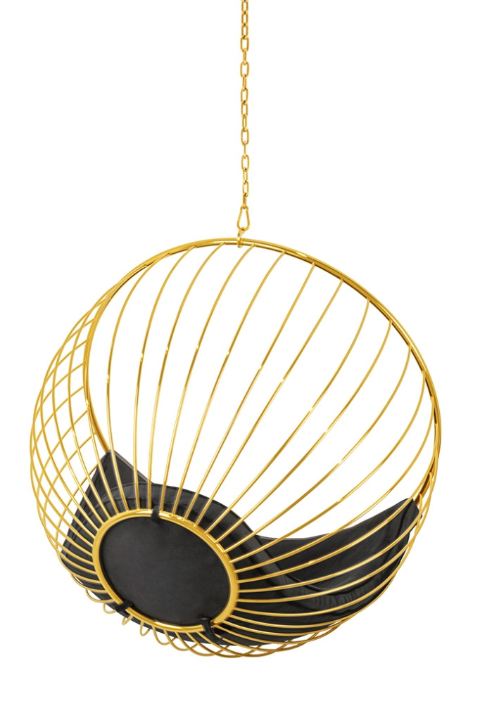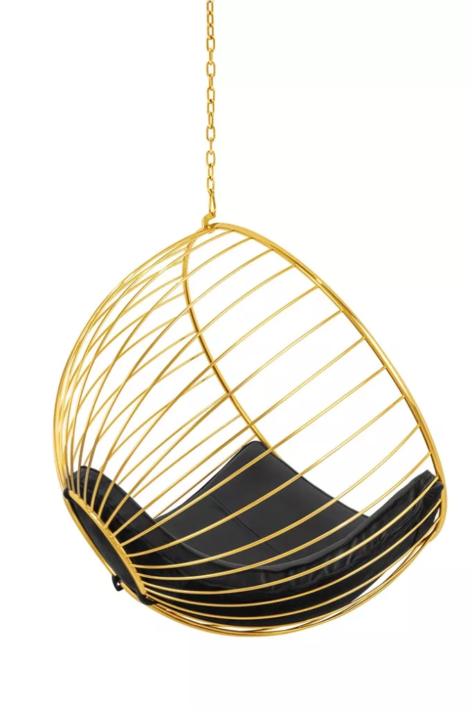 A GABBIA függőfotel egy igazi design ékszer, amely ötvözi a luxust és a kényelmet. A gömb alakú szerkezet arany színű fém váza napsugarakra emlékeztető mintázatával azonnal magára vonzza a tekintetet. Az ülőrész puha, fekete velúr kárpitozása tökéletes kontrasztot alkot az arany kerettel.