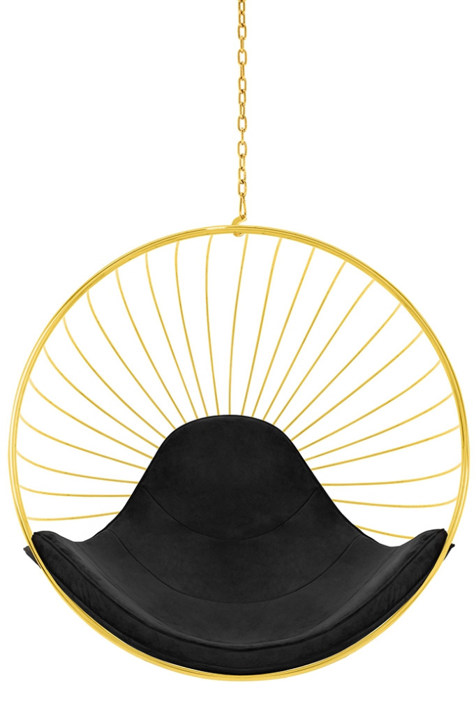 Luxus kialakítású függőfotel arany fém vázszerkezettel és fekete velúr üléspárnával, amely tökéletes választás a modern glamour stílusú otthonokba.