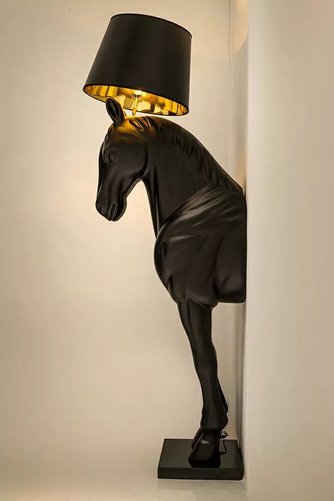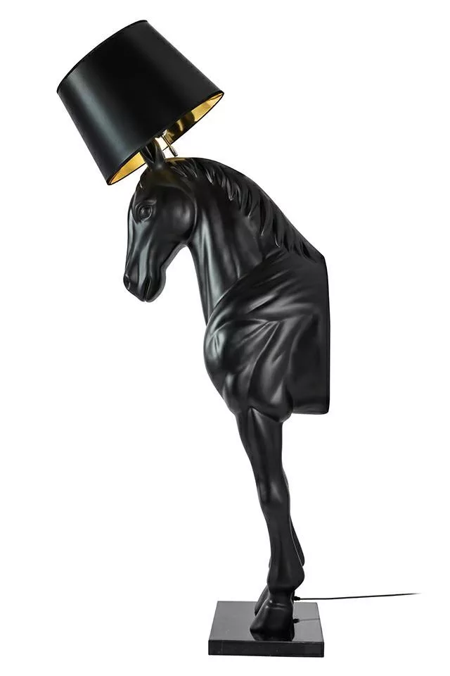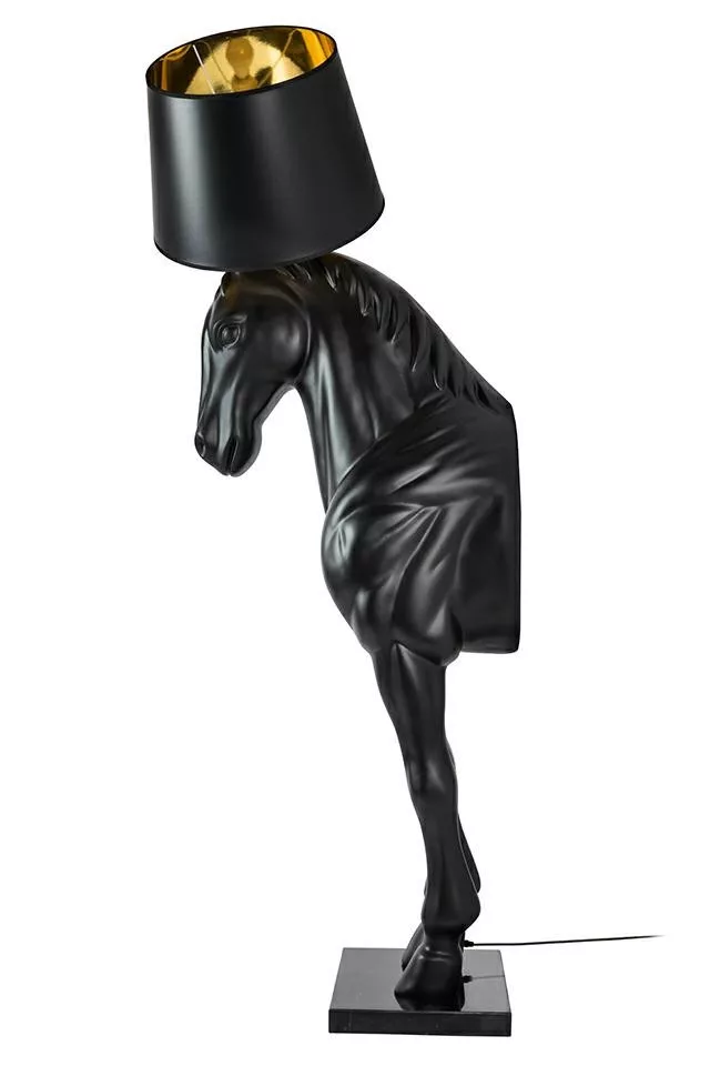 Elegáns, ló alakú állólámpa fekete üvegszálas kivitelben, arany belső árnyékolású lámpabúrával, amely egyedi és művészi megjelenést kölcsönöz otthonának.