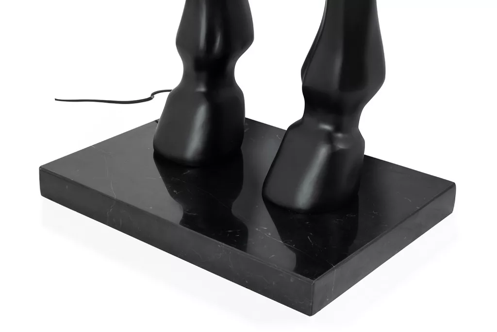 A King Home Horse Stand M állólámpa egy igazi művészi alkotás, amely a klasszikus ló motívumot ötvözi a modern világítástechnikával. A fekete, matt üvegszálból készült ló figura dinamikus mozgást sugall, míg az elegáns fekete lámpabúra arany belső borítással meleg, kellemes fényt biztosít.