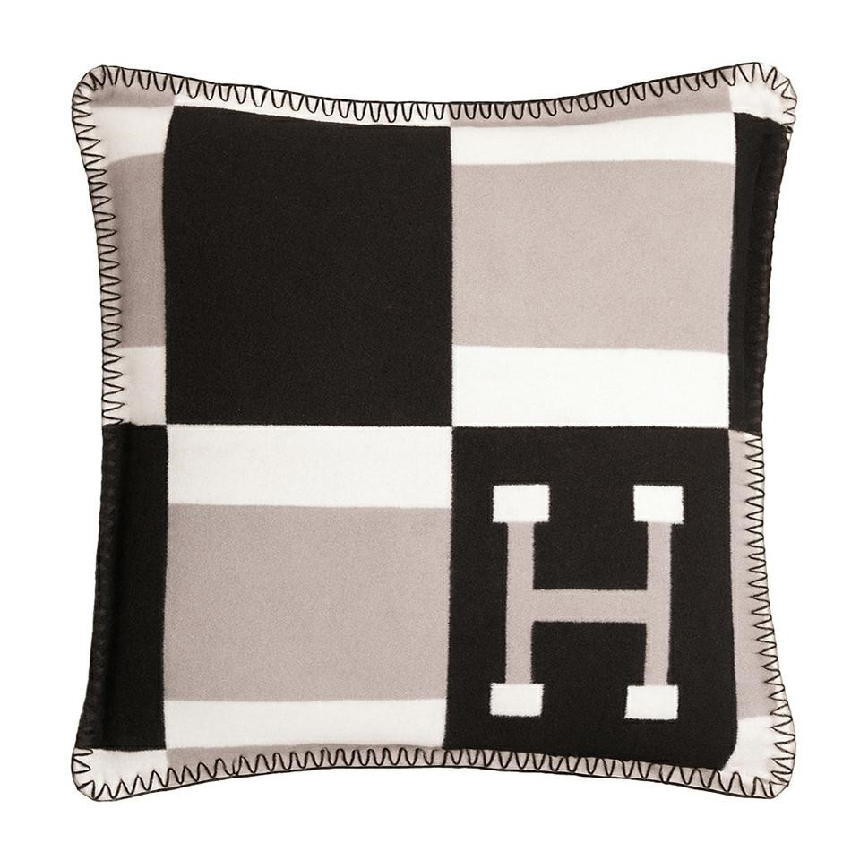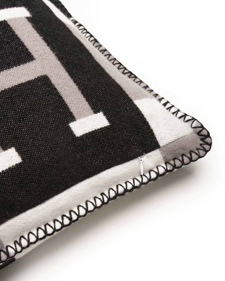 Elegáns, geometrikus mintázatú díszpárna kontrasztos fekete-szürke színvilággal és jellegzetes H-betű motívummal, amely tökéletes kiegészítője a modern lakberendezésnek.