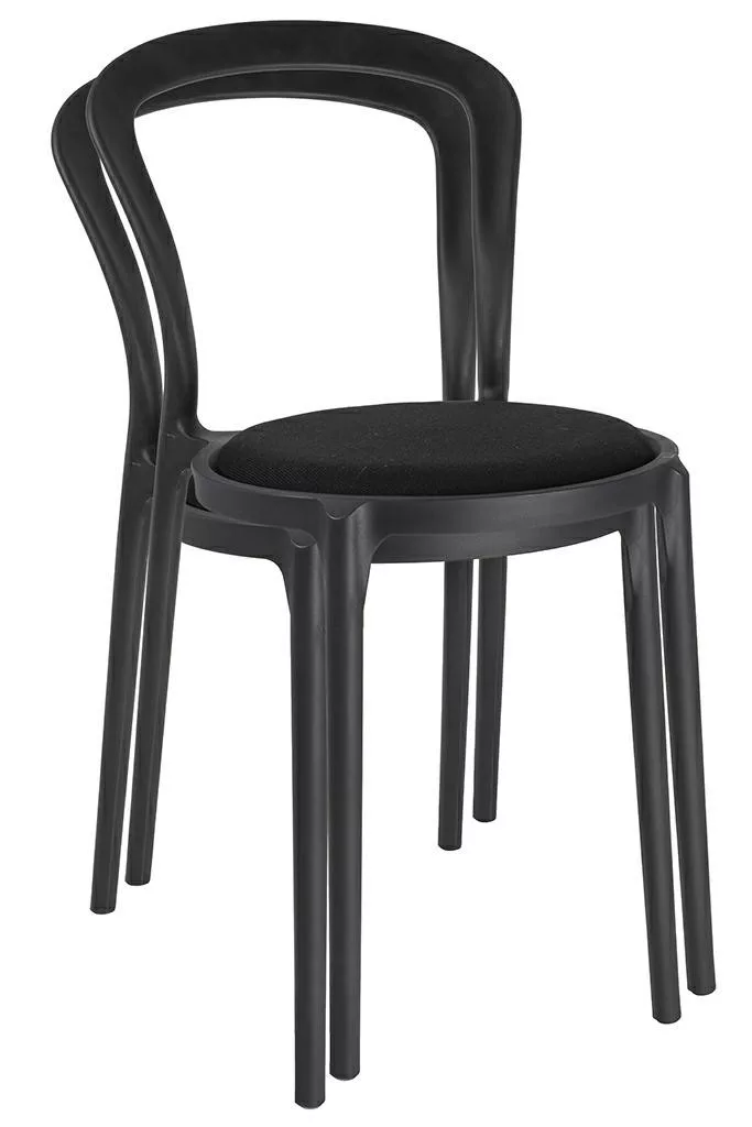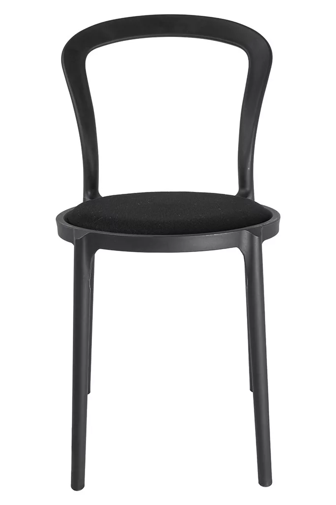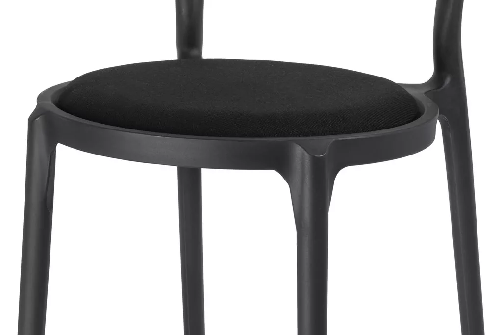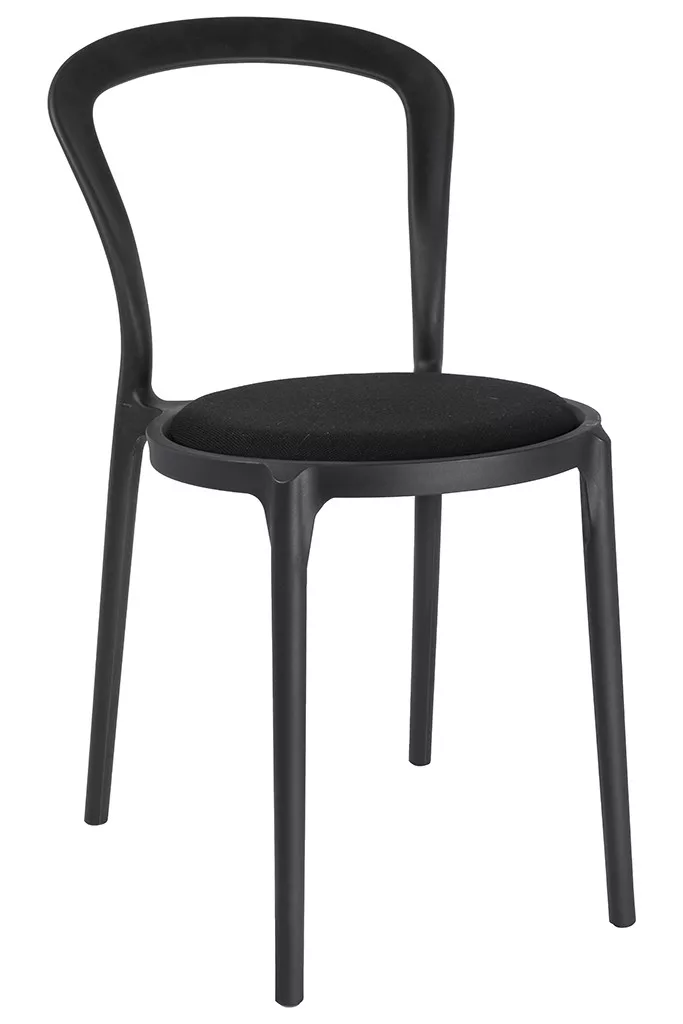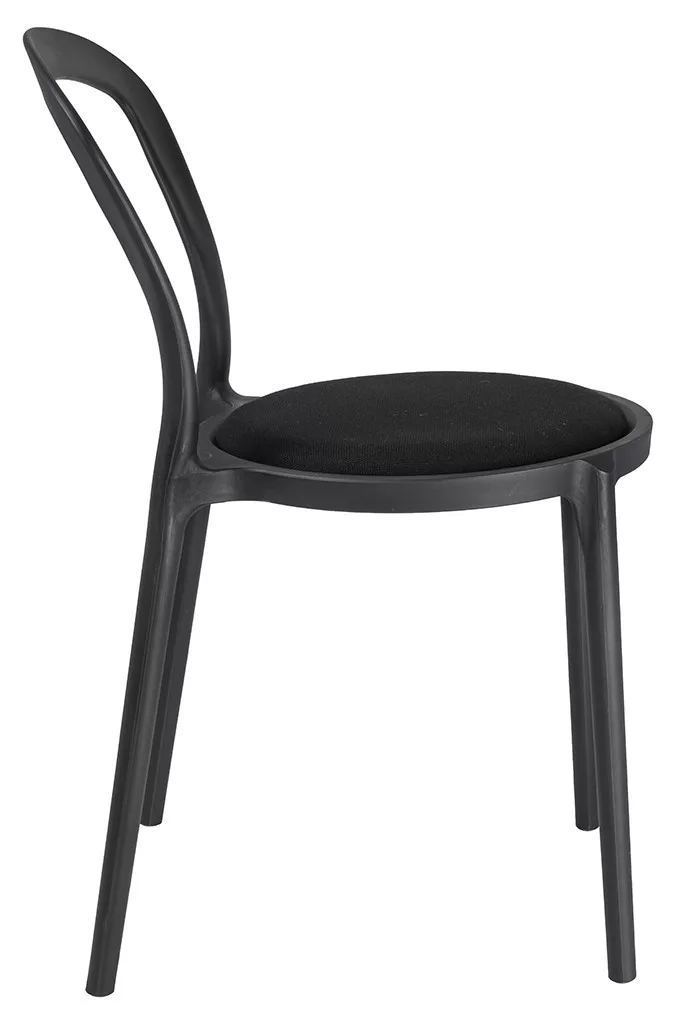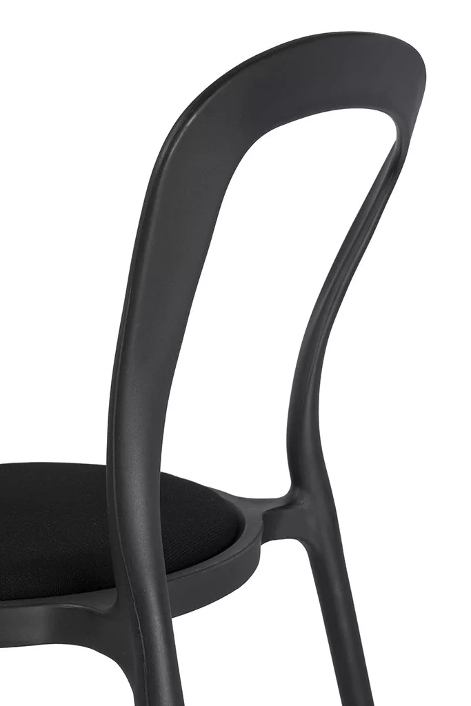 Modern vonalvezetésű, fekete polipropilén szék kényelmes szövet ülőpárnával, amely tökéletes választás mind otthoni, mind irodai környezetbe.