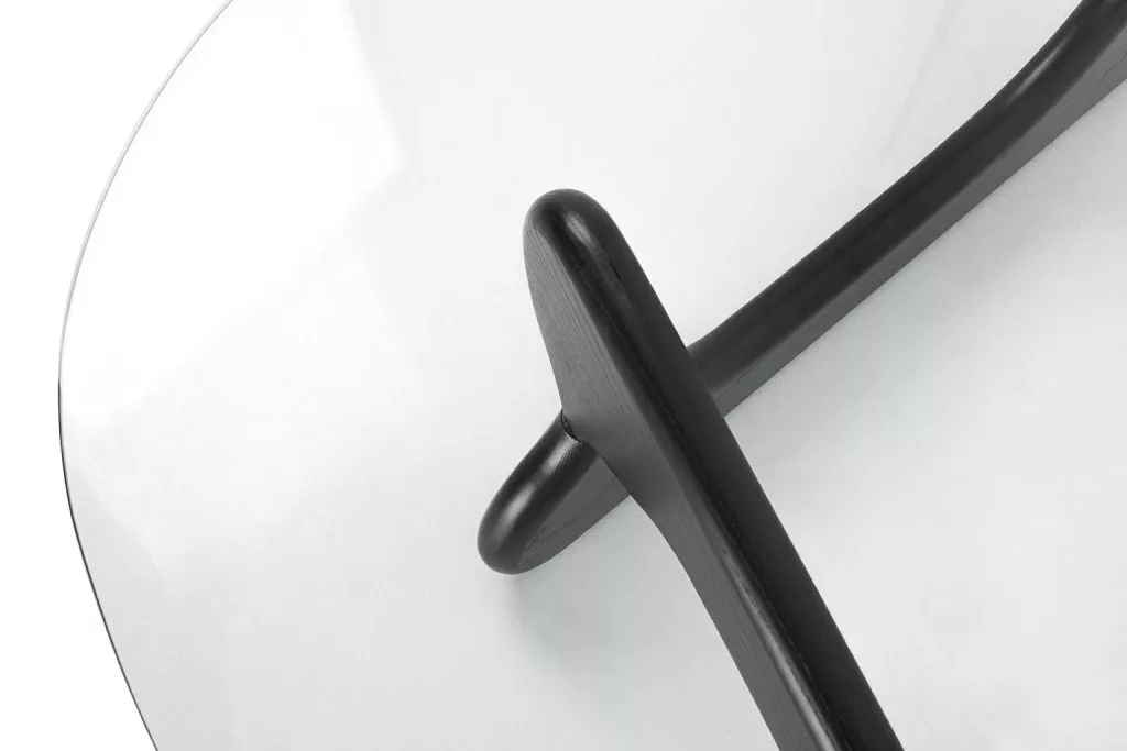 A Stable Black dohányzóasztal a modern lakberendezés kiemelkedő darabja, amely egyesíti a Float üveg tisztaságát és a fekete kőrisfa alap természetes szépségét. Az asztal különleges, ívelt formája művészi megjelenést kölcsönöz, miközben praktikus használatot biztosít.