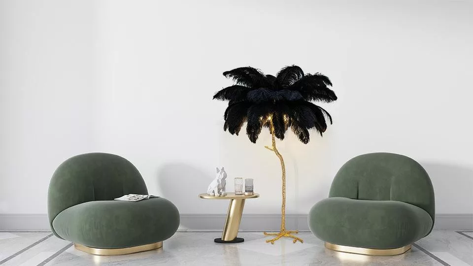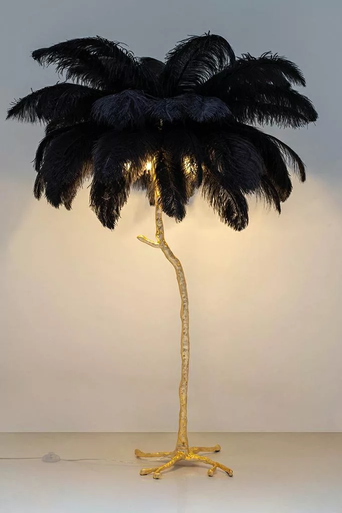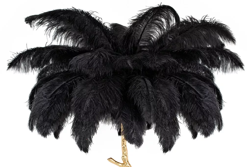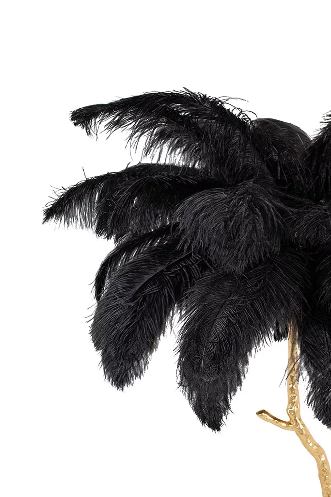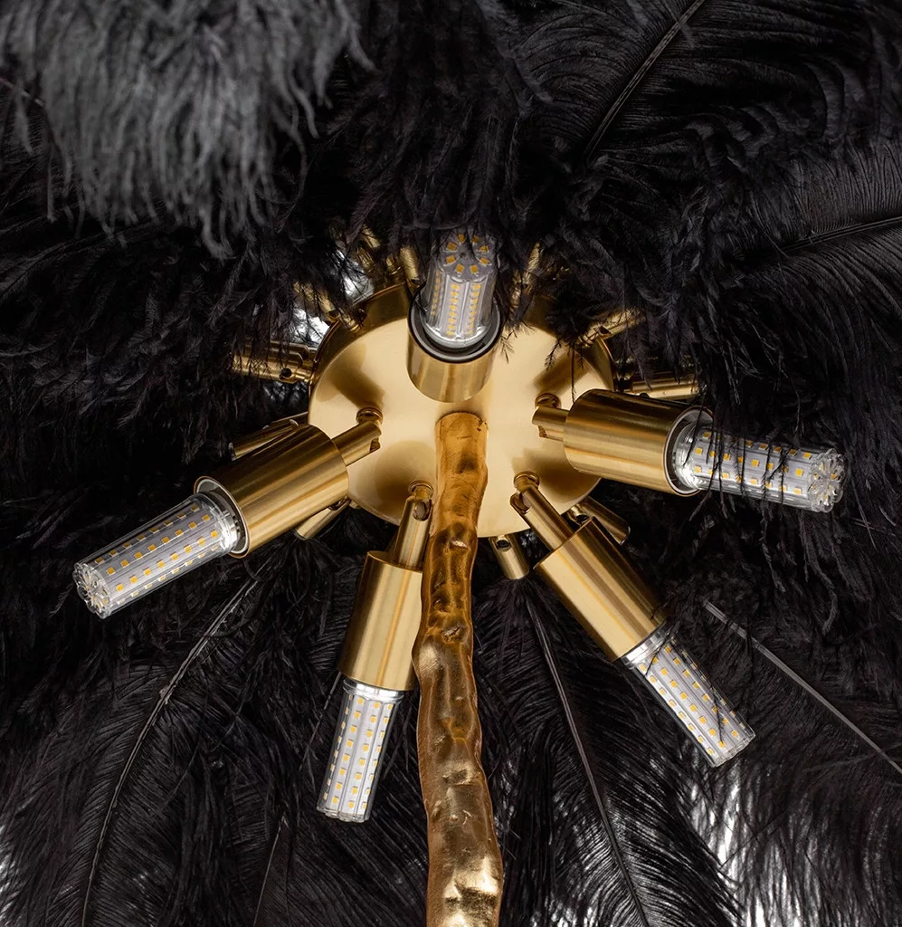 Az egyedi fa formájú dizájn és a fekete tollak drámai kontrasztja az arany színű állvánnyal különleges atmoszférát teremt bármely térben. A lámpa nem csupán világítótest, hanem egy művészi installáció, amely azonnal a helyiség központi elemévé válik.