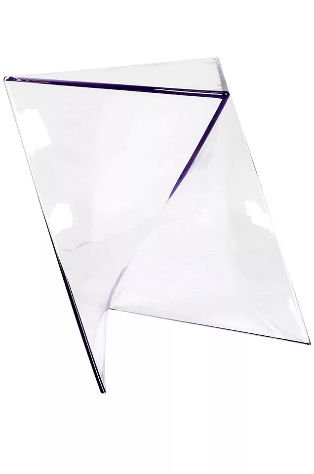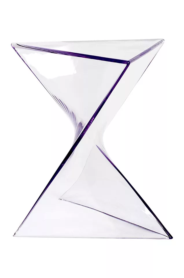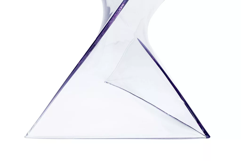 Modern, átlátszó kisasztal egyedi geometriai formával, amely tökéletesen ötvözi a funkcionalitást és a design elemeket.