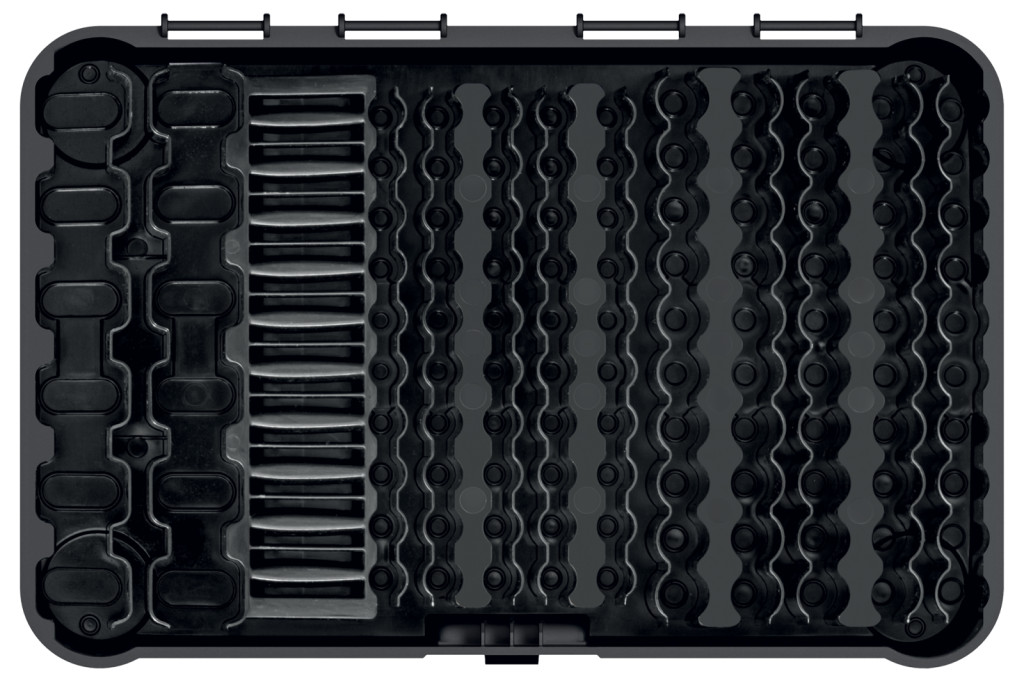 Professzionális elemtároló doboz átlátszó fedéllel, amely akár 132 különböző méretű elem biztonságos tárolására alkalmas.