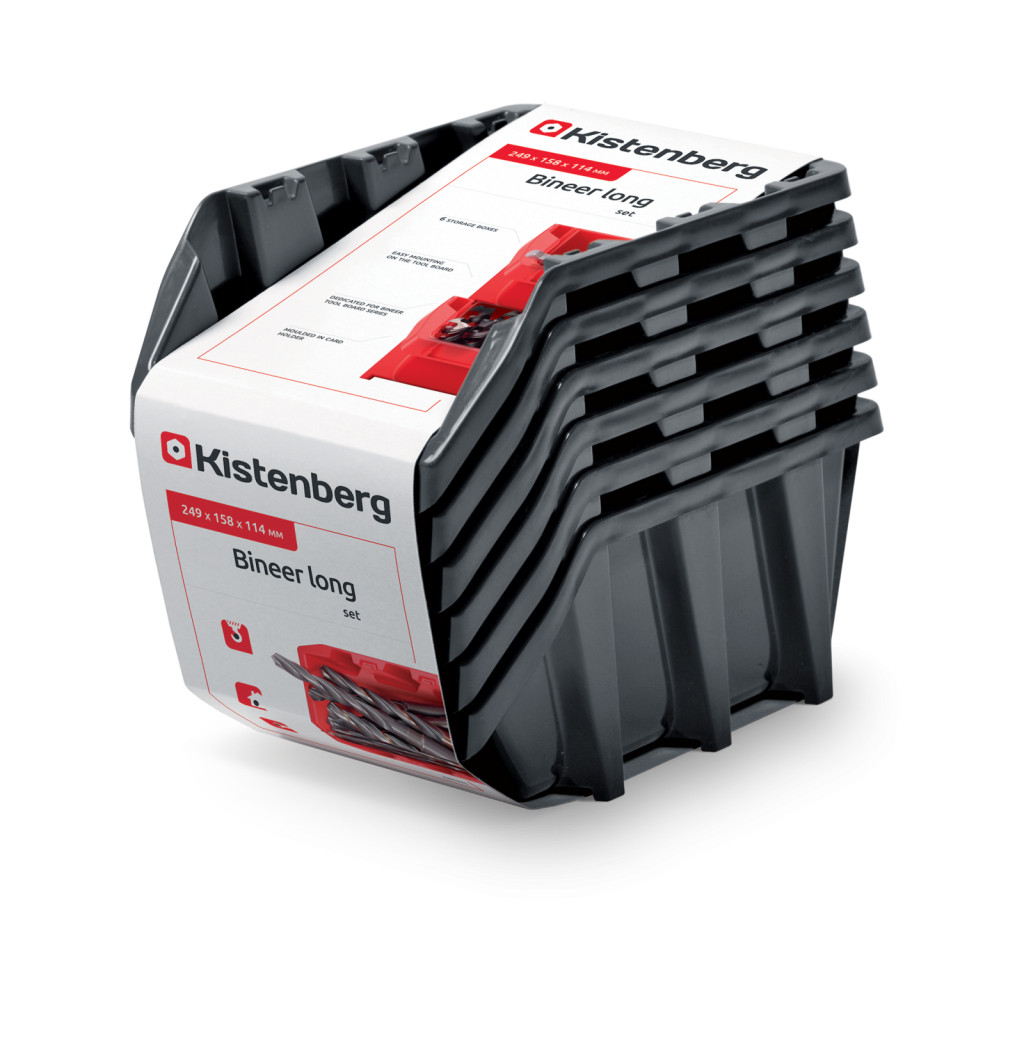 A Kistenberg Bineer Long 25 tárolórendszer tökéletes megoldást kínál a műhelyek és raktárak rendszerezéséhez. A készlet 6 darab masszív, polimer alapanyagból készült tárolódobozt tartalmaz, amelyek innovatív kialakításuknak köszönhetően egymással összekapcsolhatók és függőlegesen is rendszerezhetők.