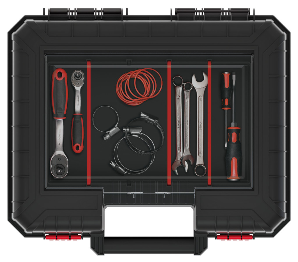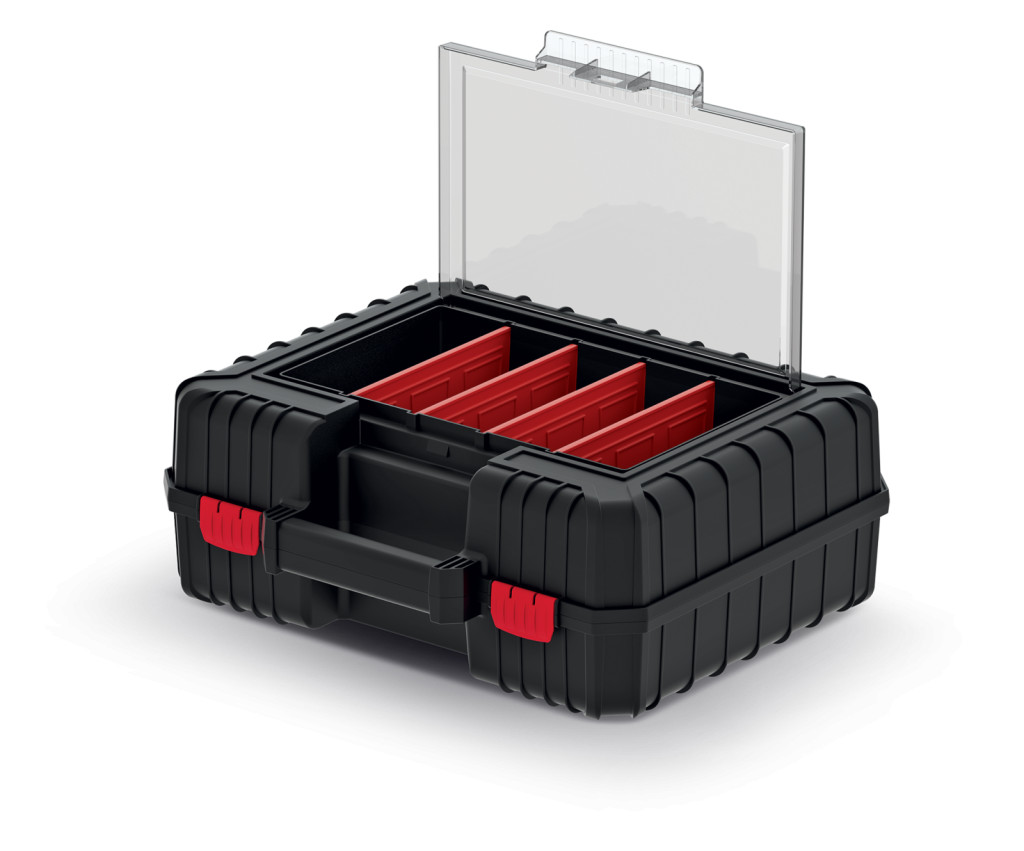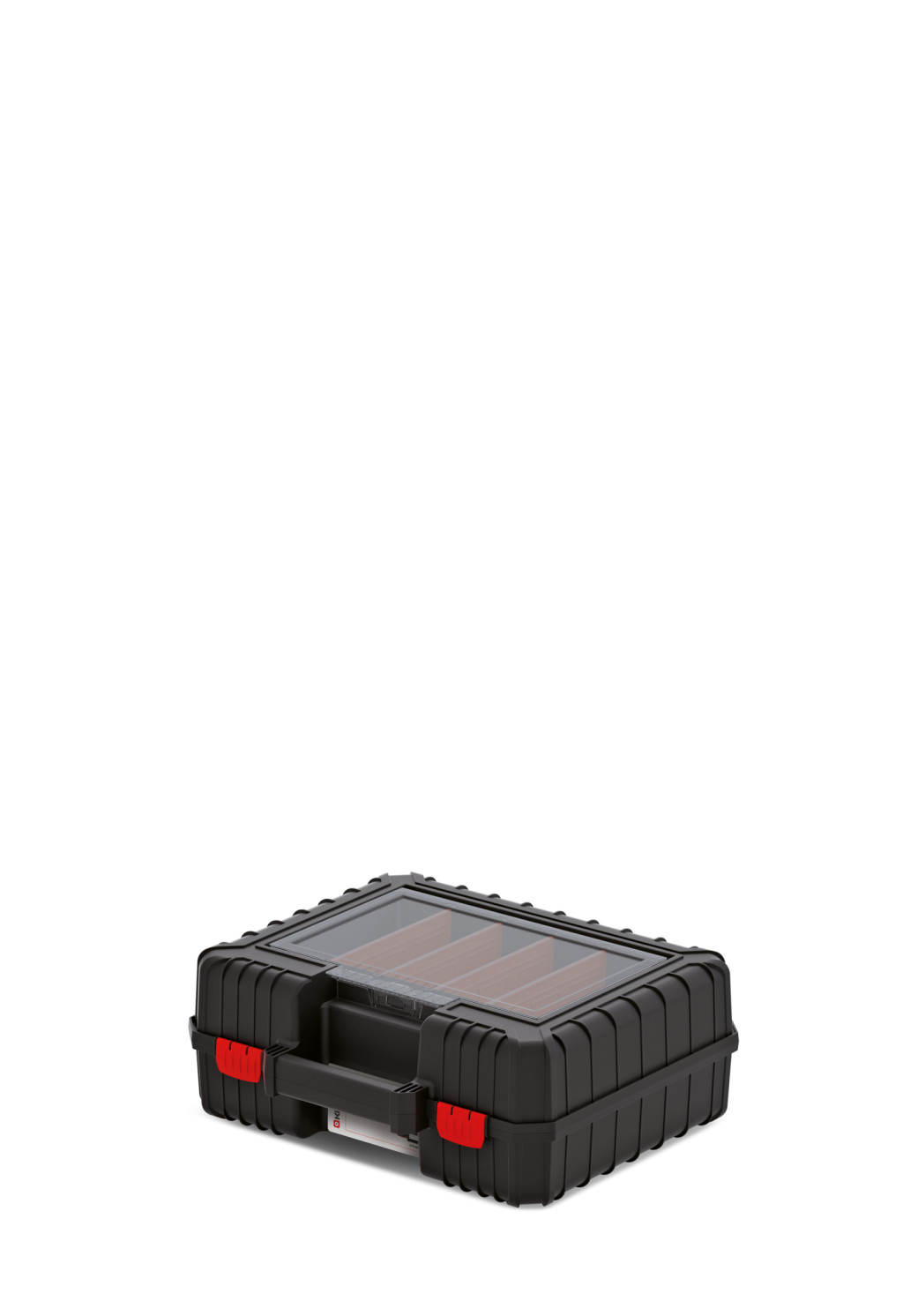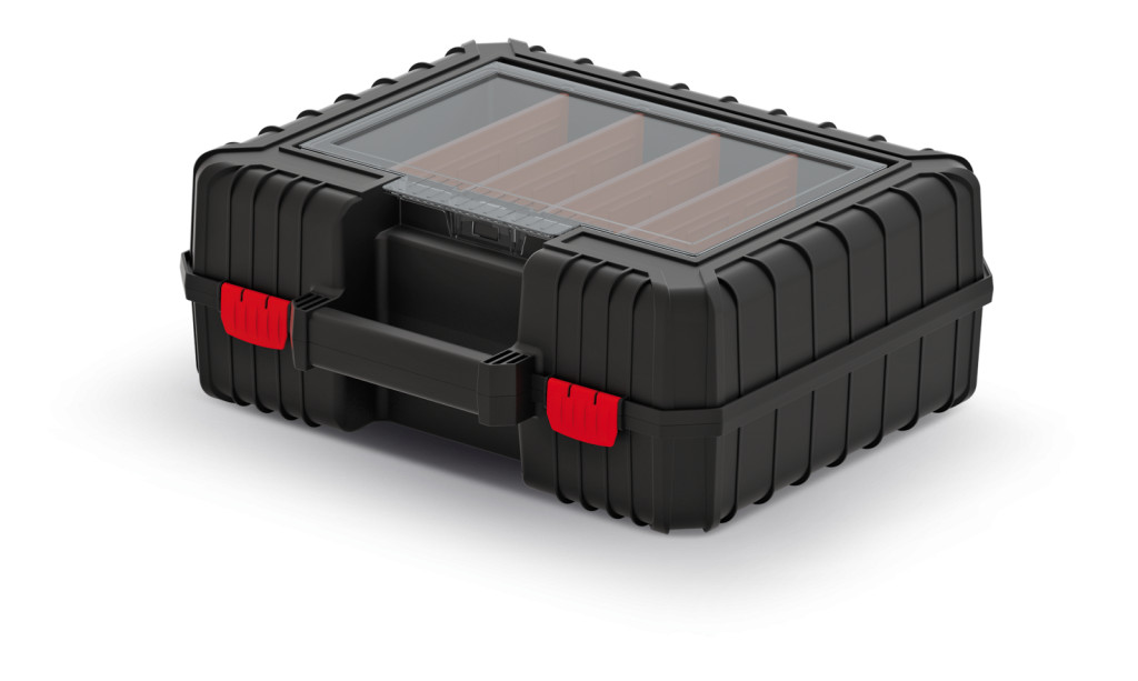 A Heavy 40 szerszámosláda a tartósság és funkcionalitás tökéletes ötvözete. A megerősített polimer háznak köszönhetően akár 10 kg terhelést is elbír, míg az átlátszó polikarbonát fedélbe épített 4 rekeszes rendszerező tökéletes áttekinthetőséget biztosít.