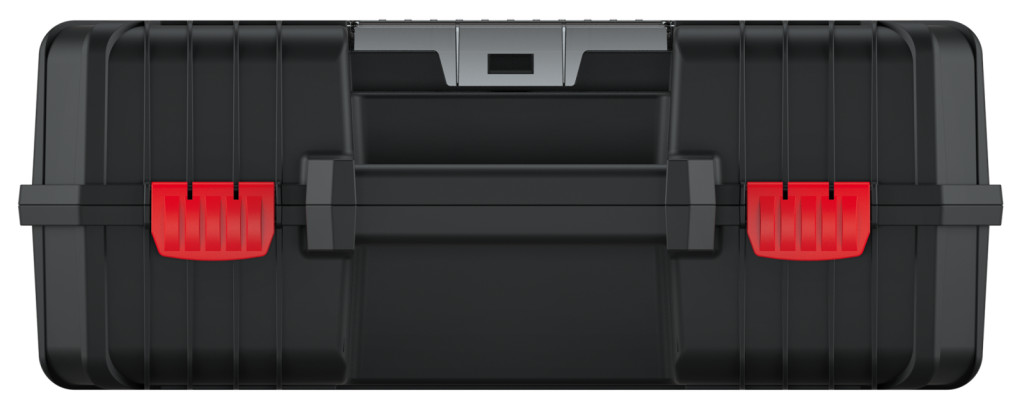 A praktikus kialakítás része az ergonomikus fogantyú és a két belső rögzítőpánt, amelyek biztonságosan a helyükön tartják a szerszámokat. A ládát strapabíró csatok zárják, így tartalma védve van a külső behatásoktól.