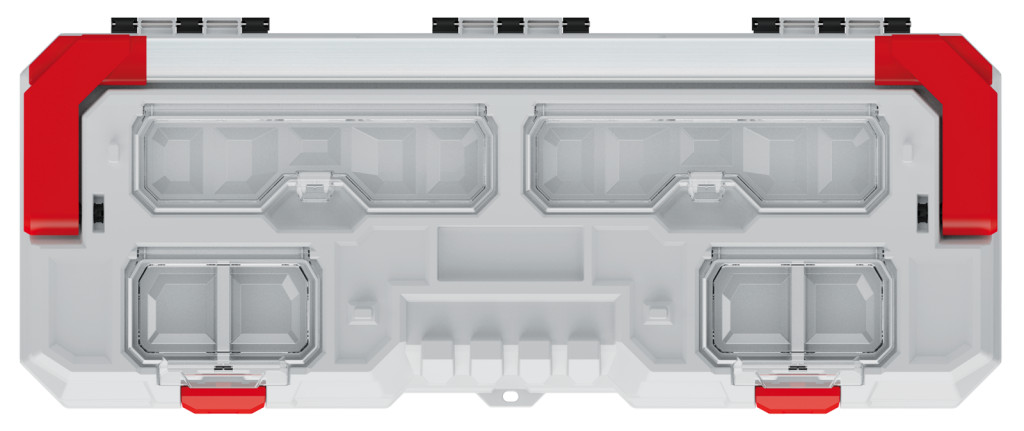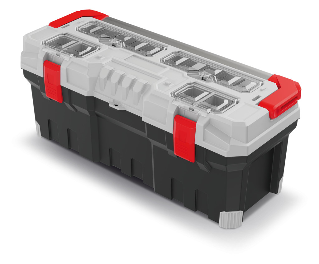 A fedélben található 4 átlátszó polikarbonát rendszerező tökéletes megoldást nyújt a kisebb alkatrészek, csavarok tárolására. Az ABS csatok megbízható zárást biztosítanak, a 30 kg-os teherbírás pedig alkalmassá teszi nagyobb szerszámkészletek tárolására is.