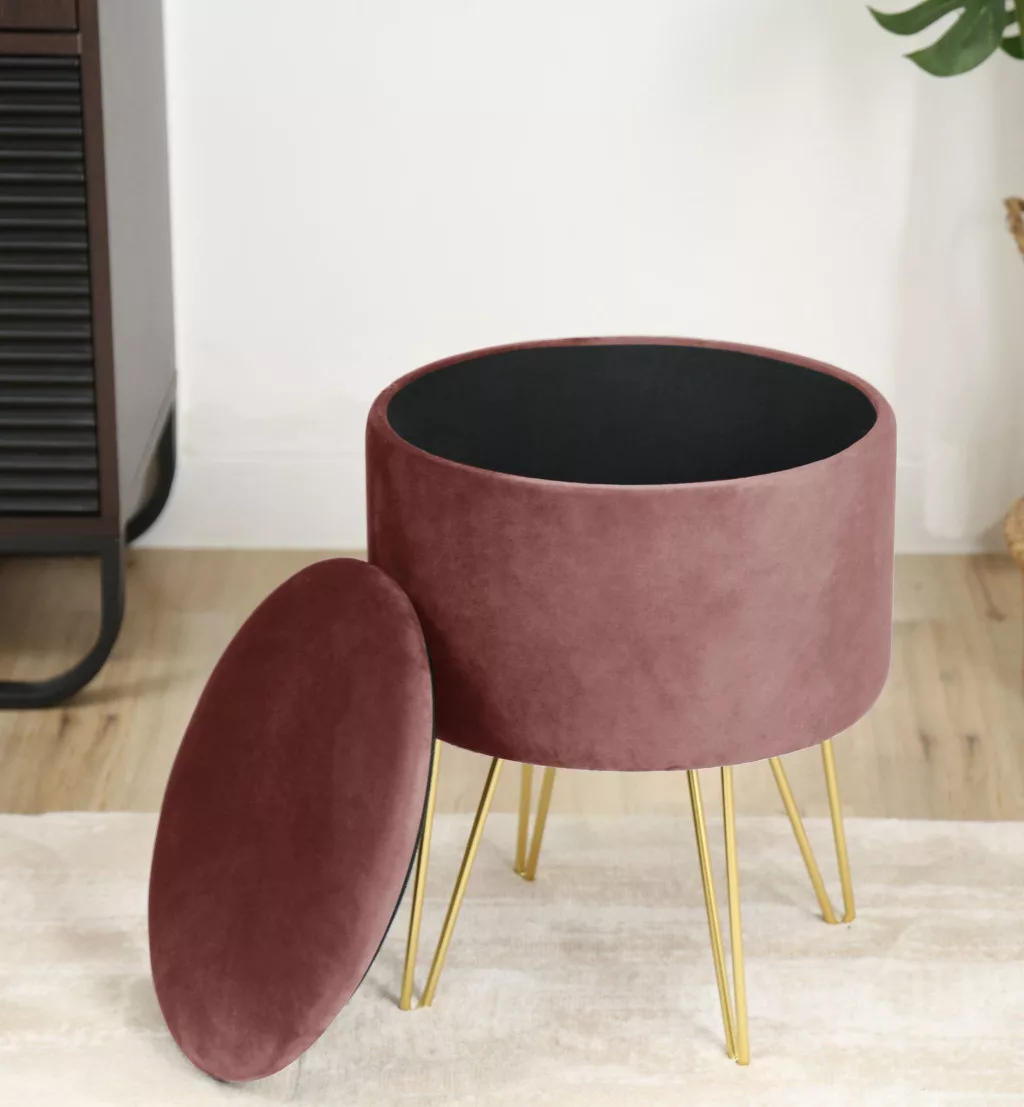 Elegáns, többfunkciós velúr puff beépített tárolóval és divatos arany színű fém lábakkal. Tökéletes kiegészítő a modern otthonokba.