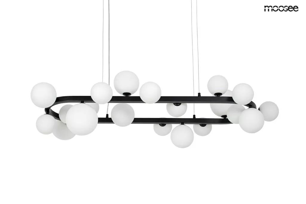 Elegáns, modern függőlámpa 20 gömb alakú tejfehér üvegburával és matt fekete acélszerkezettel, amely tökéletes megvilágítást biztosít nagyobb terekhez.