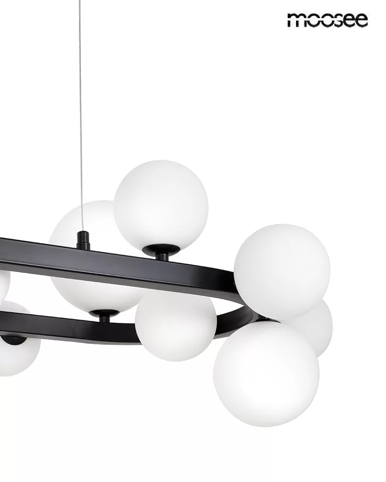 Az Alure Oval 120 függőlámpa a modern világítástechnika és az időtlen design tökéletes ötvözete. A matt fekete acélvázon elhelyezkedő 20 tejfehér üveggömb harmonikus kompozíciót alkot, amely lebegő könnyedséget kölcsönöz a lámpának. A kézzel készített üvegburák természetes módon szórják szét a fényt, meleg és barátságos hangulatot teremtve.