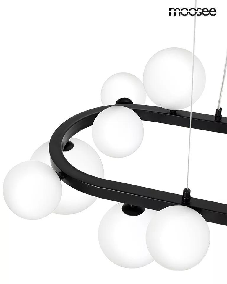 A lámpa különleges ovális kialakítása és a fekete-fehér színkombináció drámai kontrasztot teremt, amely azonnal a helyiség központi elemévé válik. Az üvegburák különböző méretei és elrendezése játékos, mégis kifinomult megjelenést kölcsönöz a lámpának.