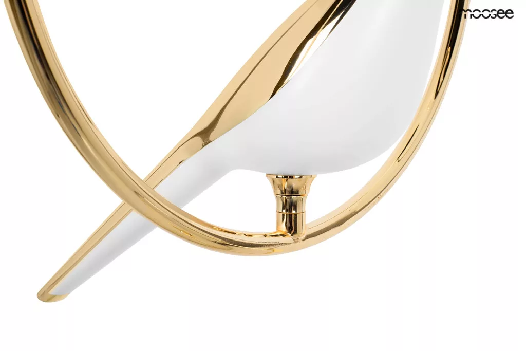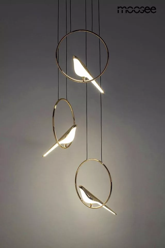 A MOOSEE Bird Disc függőlámpa egyesíti a modern design és a természet ihlette motívumok harmóniáját. A három fehér-arany madár figura arany karikákon lebeg, fekete függesztékkel kapcsolódva a mennyezethez. Az akril és fém kombinációja különleges eleganciát kölcsönöz a lámpának.