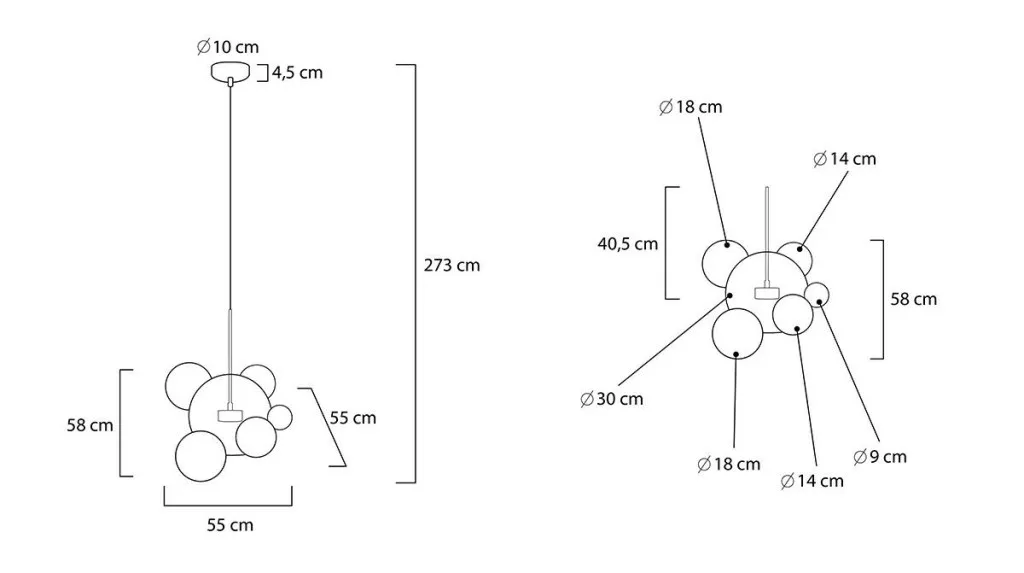• Egyedi dizájn: Hat különböző méretű üveggömb lebegő kompozíciója